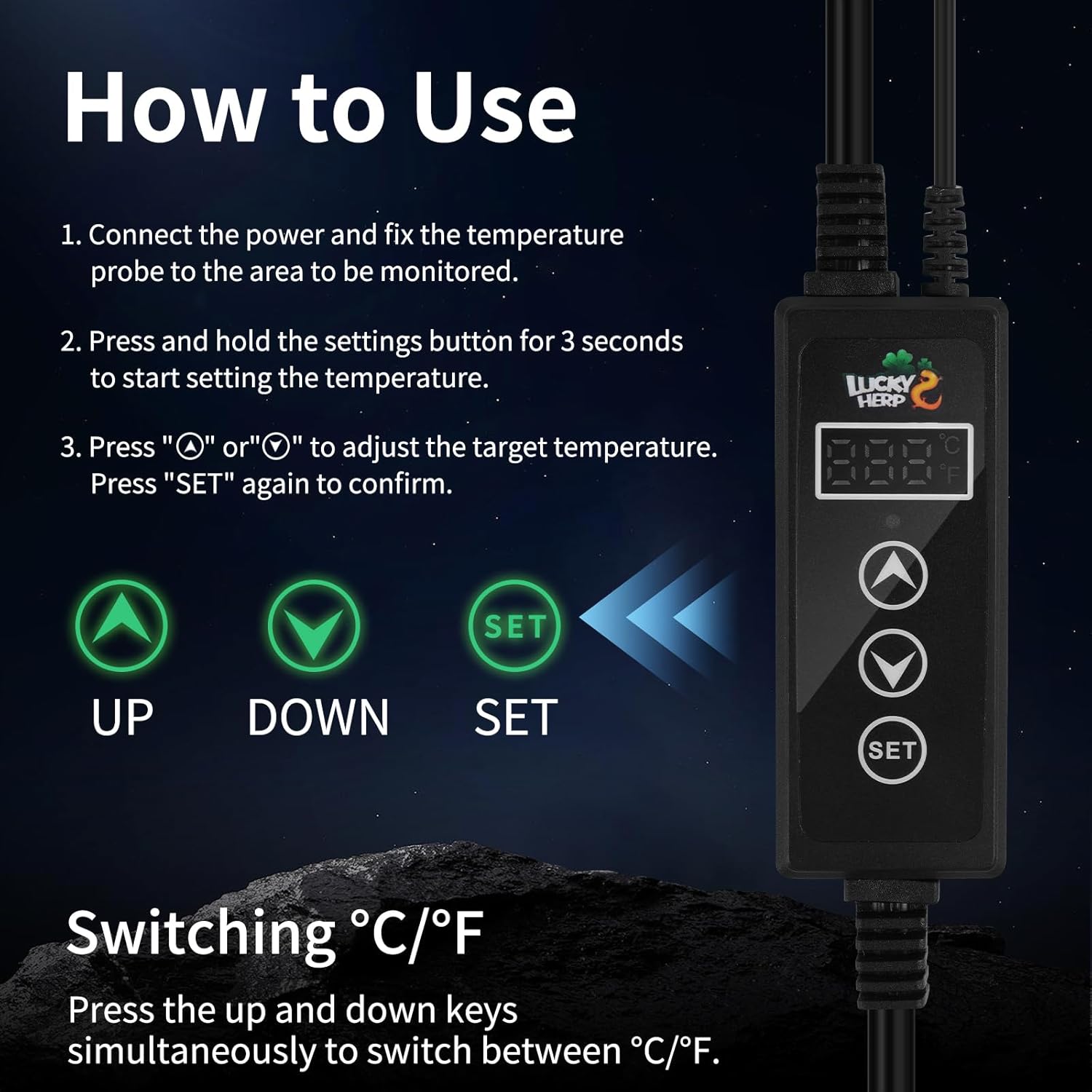 - 【Easy to Operate】Simply fix the temperature probe to the area to be monitored, connect the heating device and turn on the power. Press and hold the setup button for 3 seconds to start setting the temperature, press the up and down keys to adjust the target temperature, press the setup button again to finalize the temperature and start the operation. The LED digital display can directly display the ambient temperature and the set value, and you can switch between °C and °F randomly.