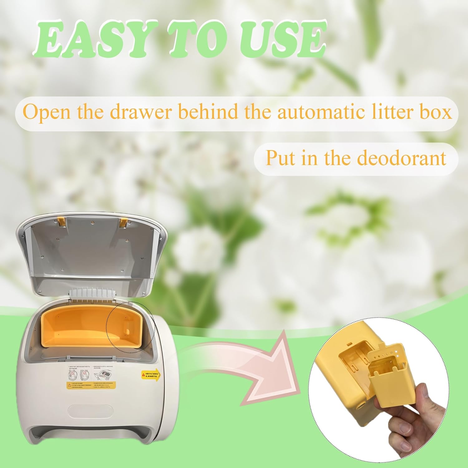 - Easy to install: Just simply open the drawer behind the automatic litter box and put in the deodorant