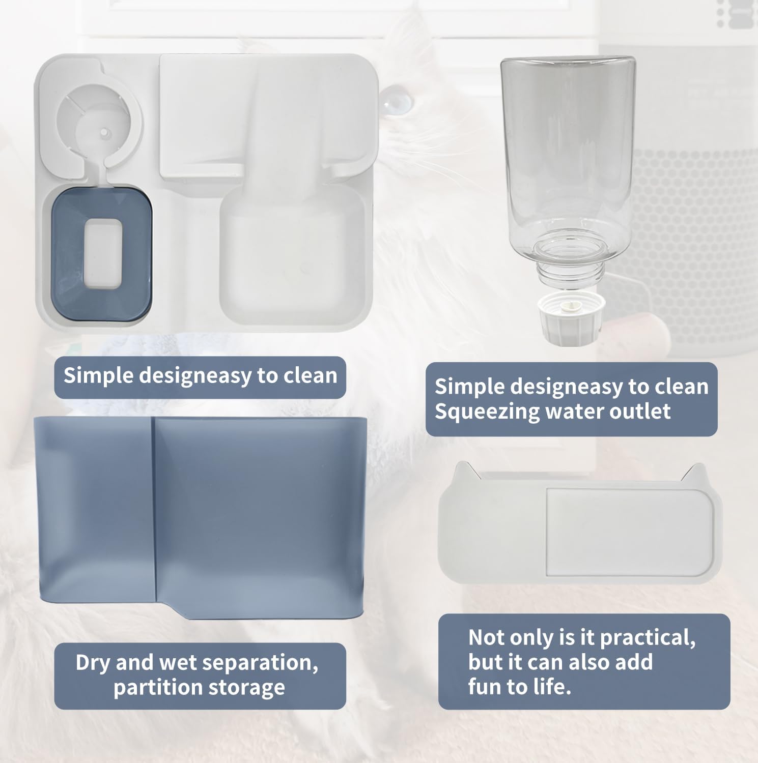 - 【Powerful environmentally friendly material】: The cat food bowl is made of PP material, which has good corrosion resistance and odor resistance. And the interface adopts multi panel assembly, which makes it easy to disassemble and clean the entire cat food bowl. The water storage bucket adopts an independent water bucket design, which effectively forms a dry wet separation. The grain storage bucket is made of transparent high-density splicing, which has good sealing performance. At the same time, it is also convenient to observe the remaining grain in the cat food bowl.