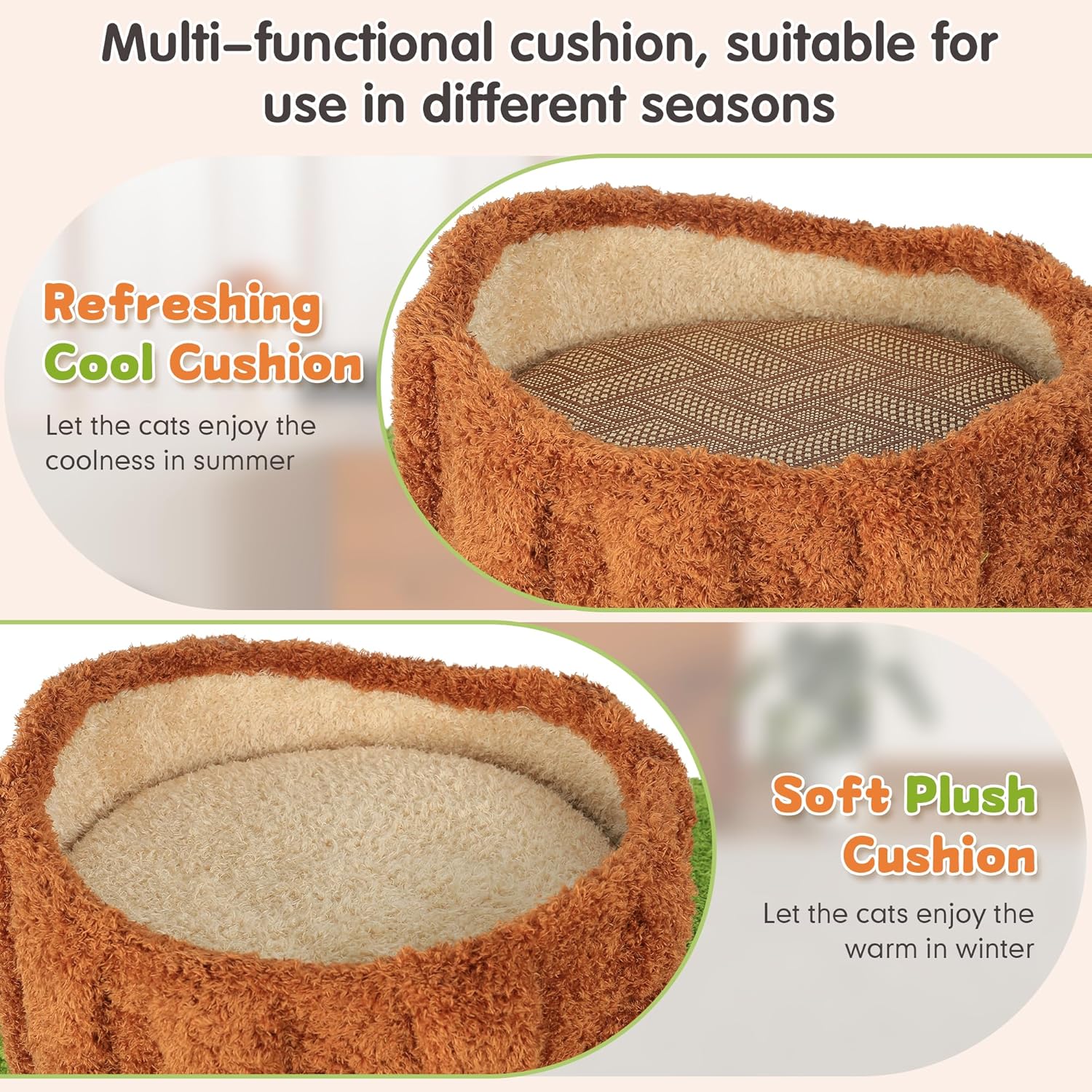 - 【Different Design】Different from normal cat trees, our captivating column cat tree showcases a unique mix of brown and green. It not only provides an eye-catching haven—the perfect play and rest area for your feline friend—but also adds a fresh decorative accent to your living room. Each level is adorned with luxurious, soft fabric, so your kitty can enjoy a royal treatment and a blissful nap