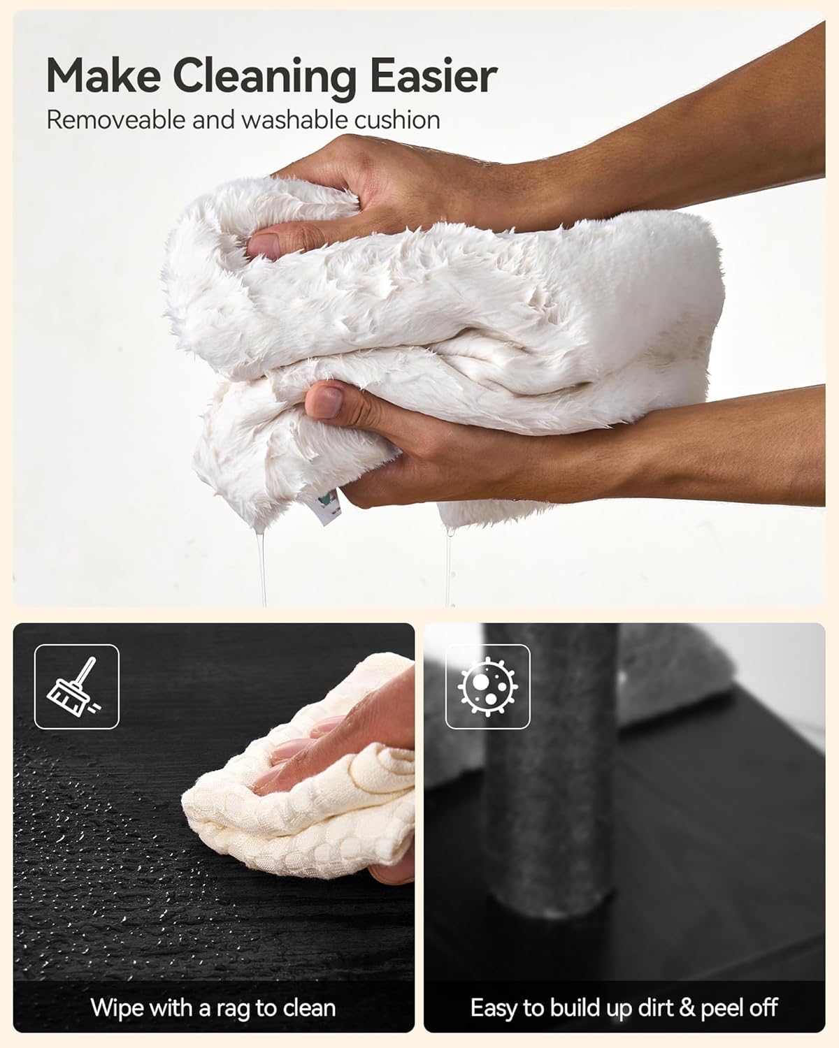 - DURABLE AND EASY TO CLEAN DESIGN : This cat tree for big cats is designed with a scrubbable board veneer platform, which is stain-resistant and dirt-resistant and can be wiped clean in one wipe; with removable washable cushions, hygiene and maintenance are easier. The sisal winding post and massage brush design fully satisfy the cat's nature of claw grinding and itching