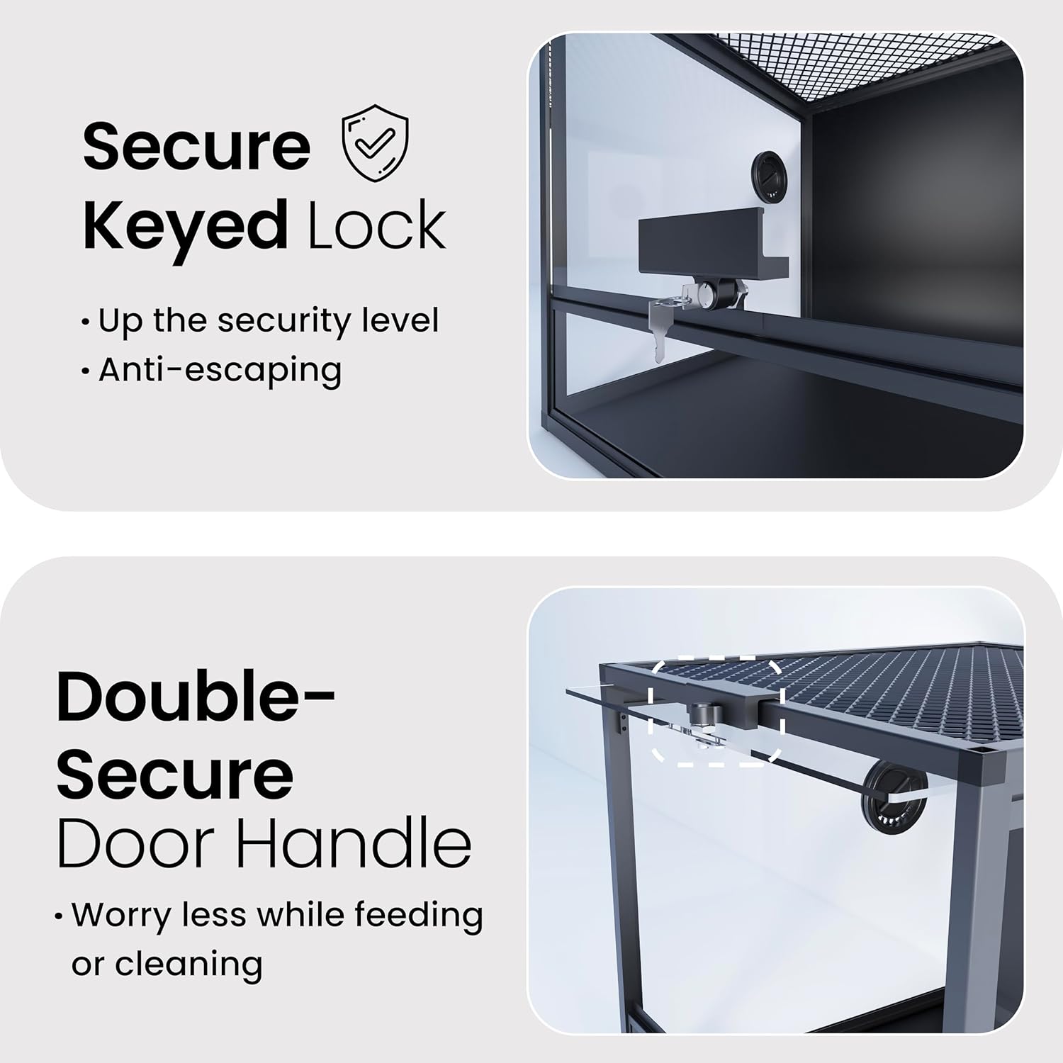 - γLock IncludedγA tempered glass door with a safety keyed lock to prevent escape and accidental opening by others. NO GAPS FOR ESCAPING with fully closed structure. Rigid tempered glass doors for extra safety.