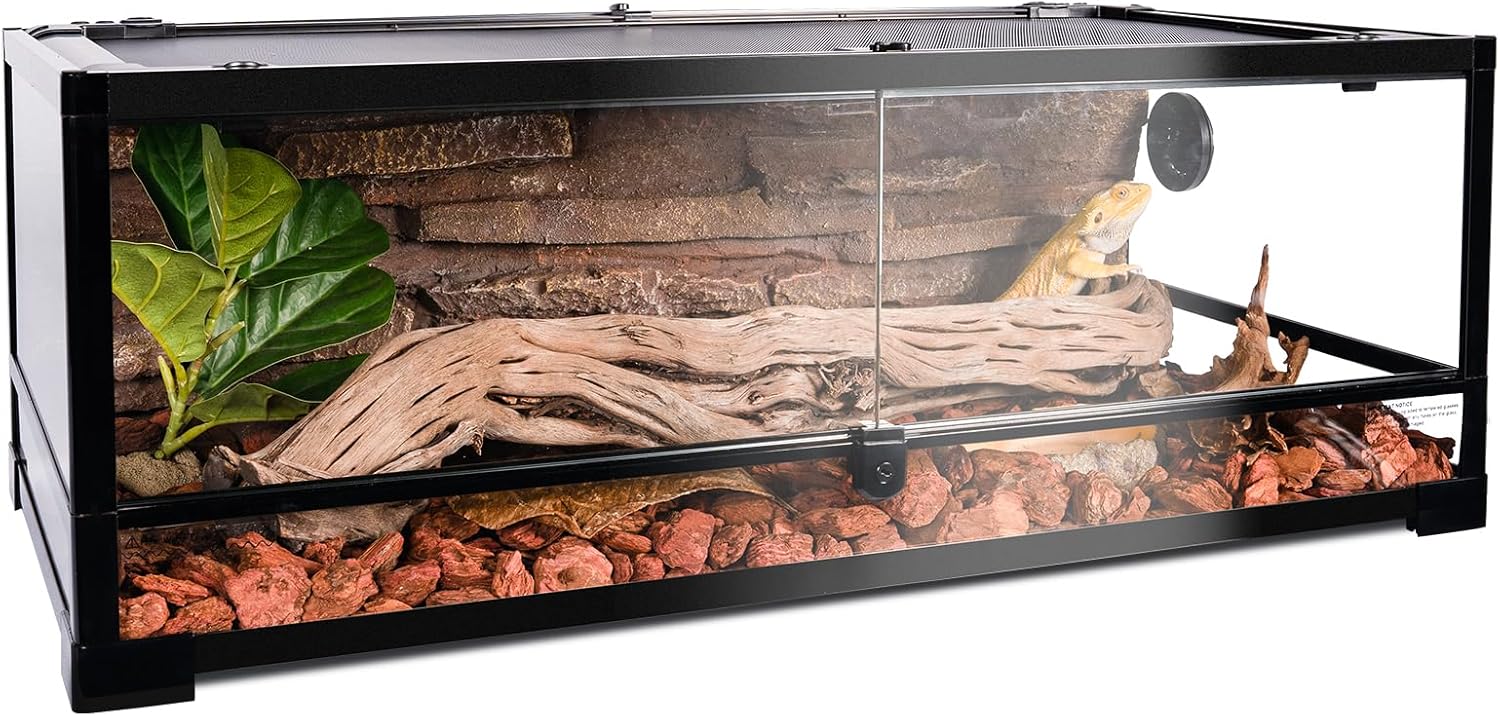 - Premium & Durable Construction: Featuring tempered glass on all four sides and aluminum alloy frame, iron mesh top, this terrarium delivers exceptional durability. Provides crystal-clear, uninterrupted viewing from every angle β an essential component for reptile habitat