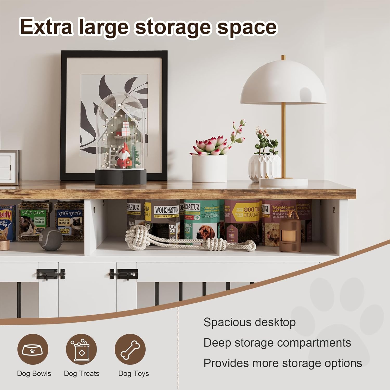 - [Storage Shelf Design] This large dog crate furniture seamlessly fits various home decors. Its wide desktop and open storage shelves easily organize your pup's treats and toys, keeping pet items tidy