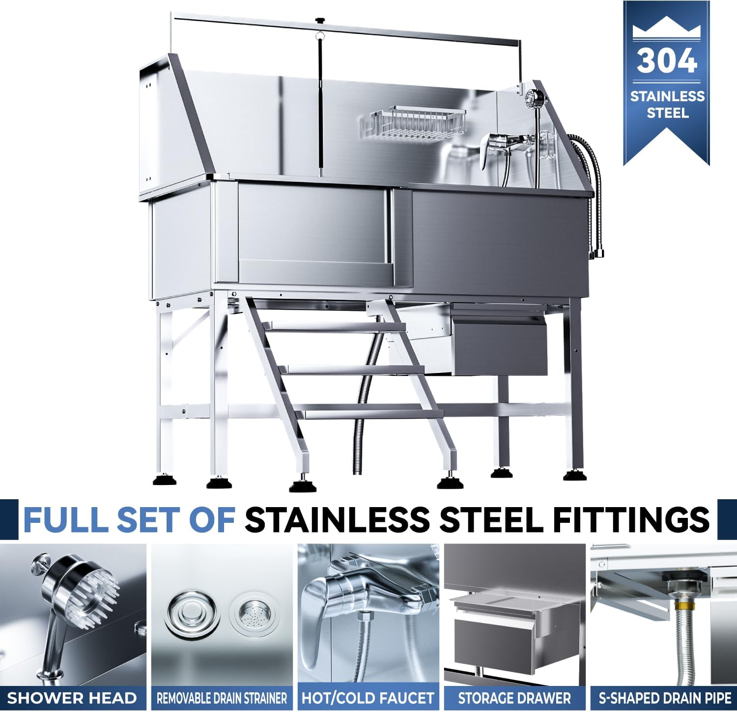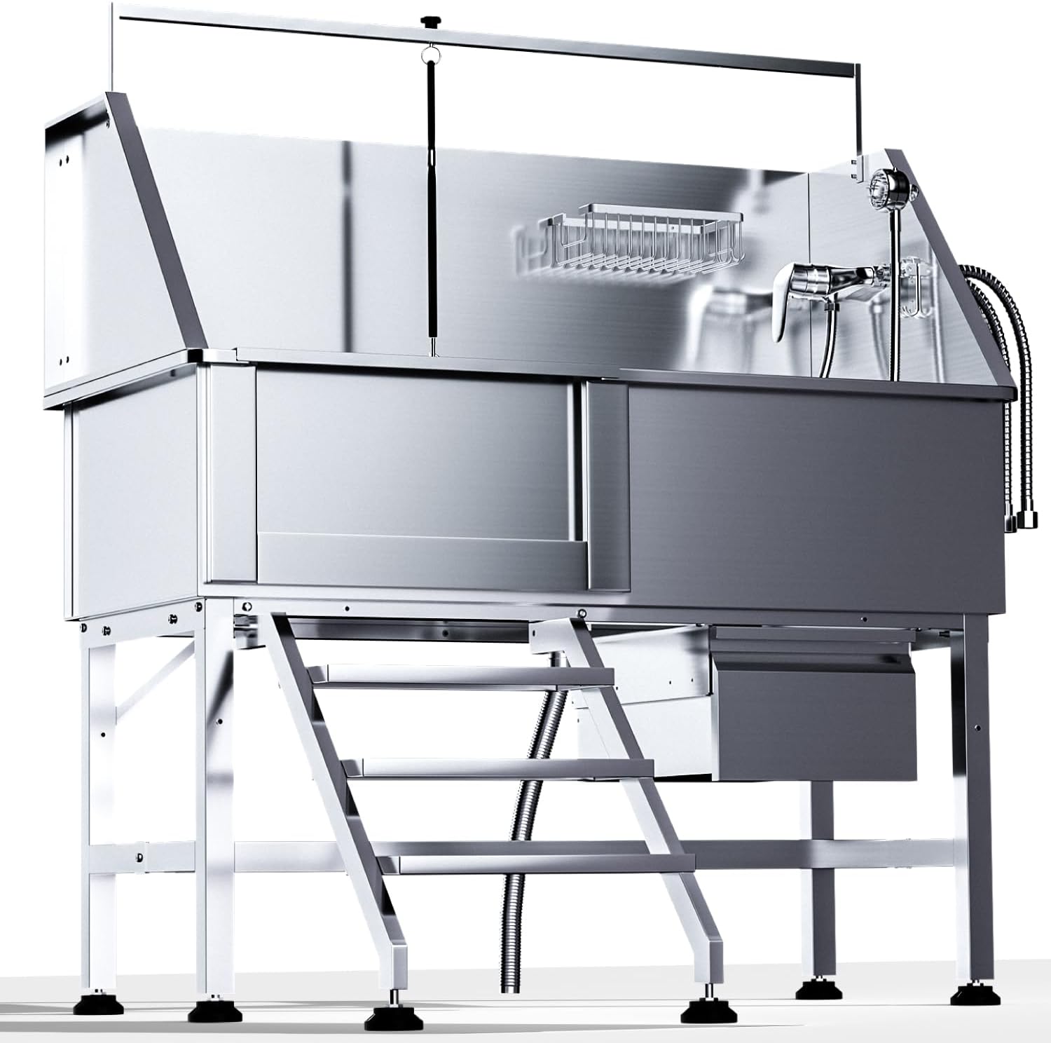 Professional 46" Dog Washing Station, Stainless Steel Dog Bathing Station, Height Adjustable Dog Wash Station, Storage Drawer, Upgrade Parts, Home, Commercial (Left Step)