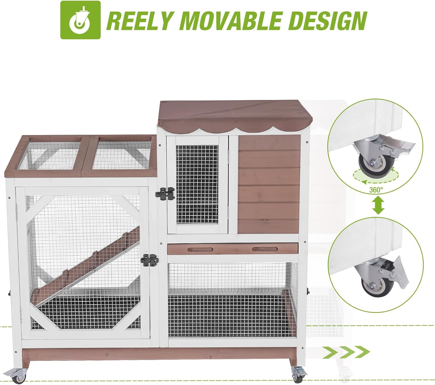 Gutinneen 2-Story Rabbit Hutch with Chew-Proof Ramp & Leak-Proof Trays - Indoor/Outdoor 39.3" Wooden Rabbit Cage with Wheels for Rabbits, Guinea Pigs