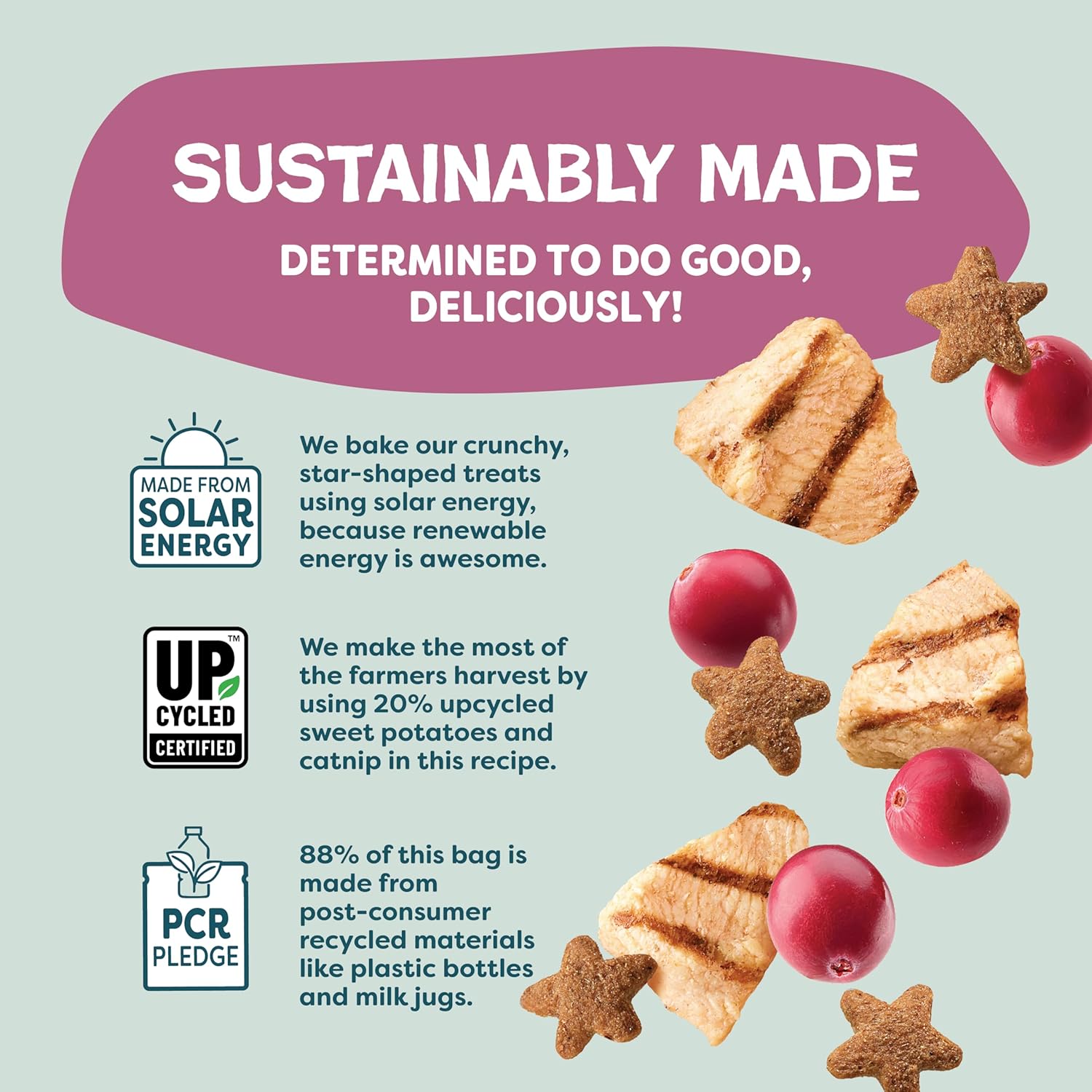 - Upcycled With Care: We work with farmers to rescue their imperfect sweet potatoes that have all the same healthy nutrients. This means every bag of our treats decreases food waste while saving valuable resources.