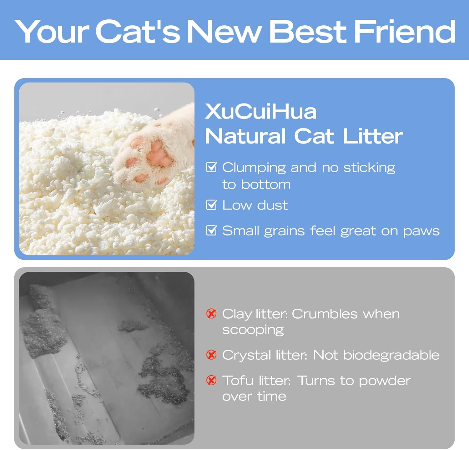 - LOW DUST: Minimal dust while pouring or scooping keeps the air cleanβbetter for your catβs breathing and your furniture. No silica or clay dust for a truly dust-free cat litter experience.