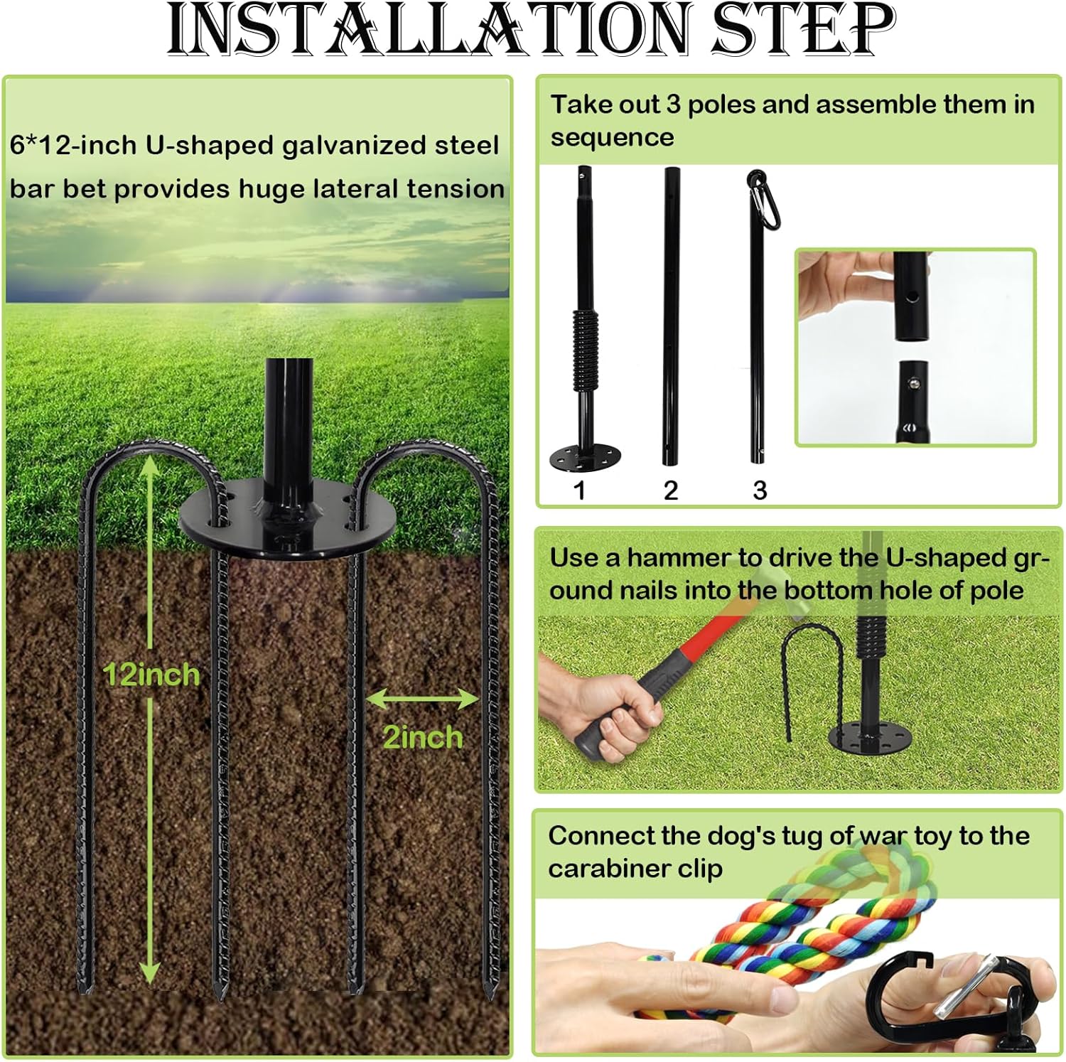 - Stable on the Ground:6*12-inch U-shaped galvanized steel bar bet provides huge lateral tension, the metal rods and base plates are hand-welded by professional workers, and it is basically impossible for dogs to pull it out laterally