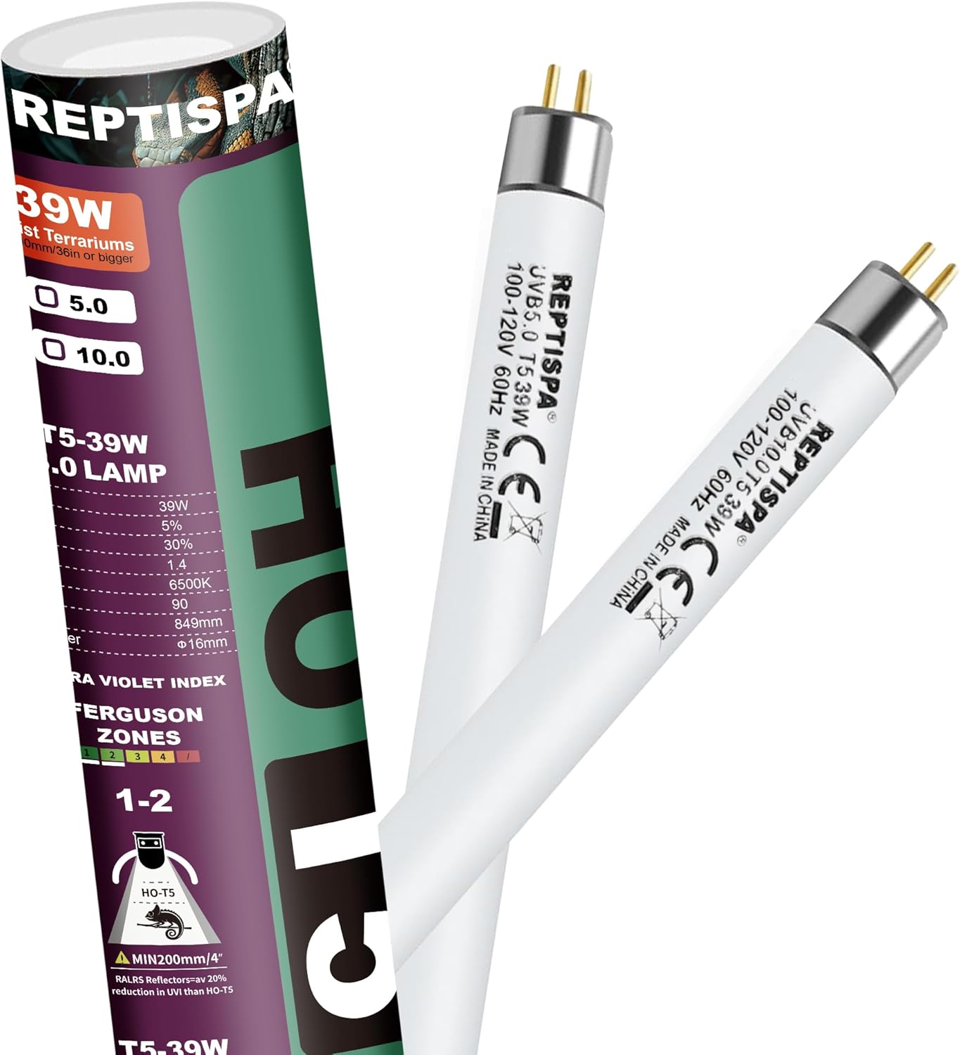 5.0 UVB Light for Reptiles, T5 HO 39 Watt Reptile Lamp Tube, Pack of 2 Fluorescent UVB Bulb, Basking Light for Bearded Dragon, Simulate Natural Sunlight for Reptiles and Amphibians