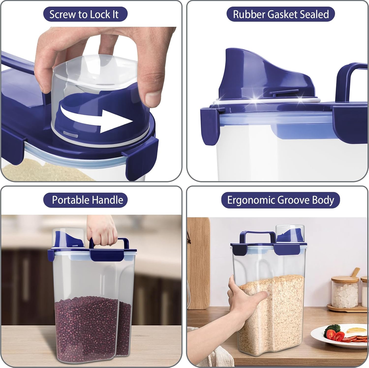 - đĽŤăAirtight Seal Rice StorageăThe airtight rice storage diepenser with featuring airtight 4 side-locking lid and measuring cup screw on over the pour spout, can protect food from moisture, ants and all bugs, and keep them dry and fresh. Say goodbye to stale and soggy food!