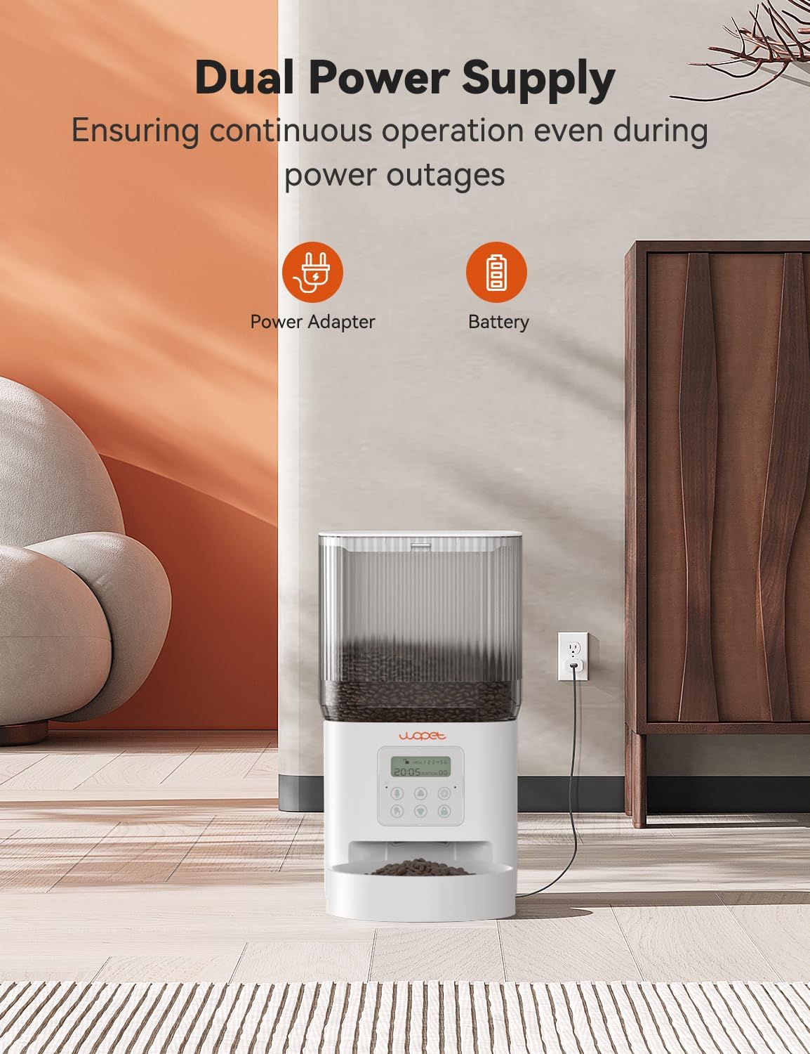 - Battery Power 180 Days Long Life:Automatic pet feeder supports Type-C socket power supply and battery power dual power supply operation, and preferred socket power supply (no loss of battery power), energy-saving (low power consumption); battery life of up to 180 days, when the socket power supply is disconnected, the feeder is automatically activated by the battery power supply.οΌbatteries are not includedοΌ