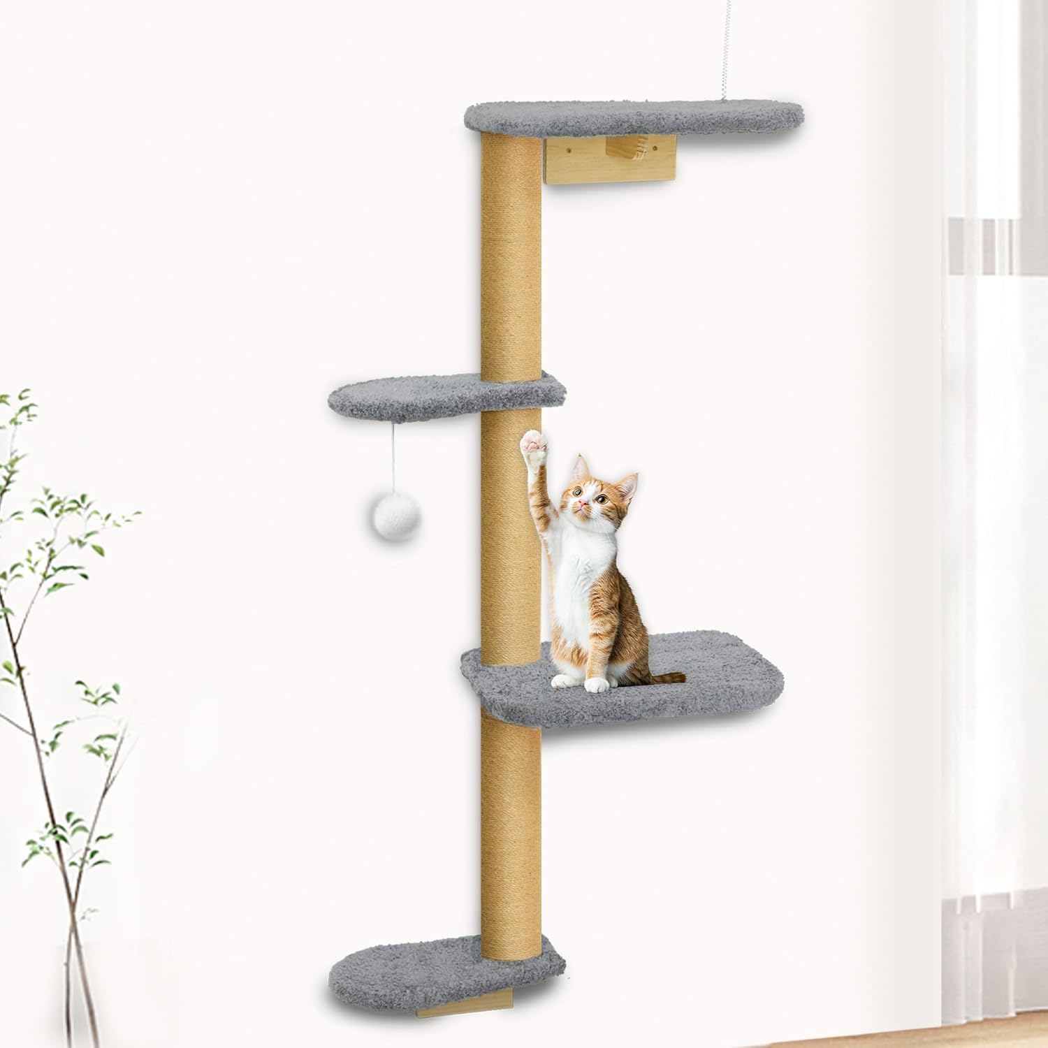 - Triple-Anchor Mount for Steady Support: This wall-mounted cat climber anchors at three secure points to ensure maximum stability. From climbing to jumping, your cat’s movement stays supported. The jute posts provide traction during ascent, and the soft plush cushions minimize impact when landing—keeping curious kittens safe and confident.