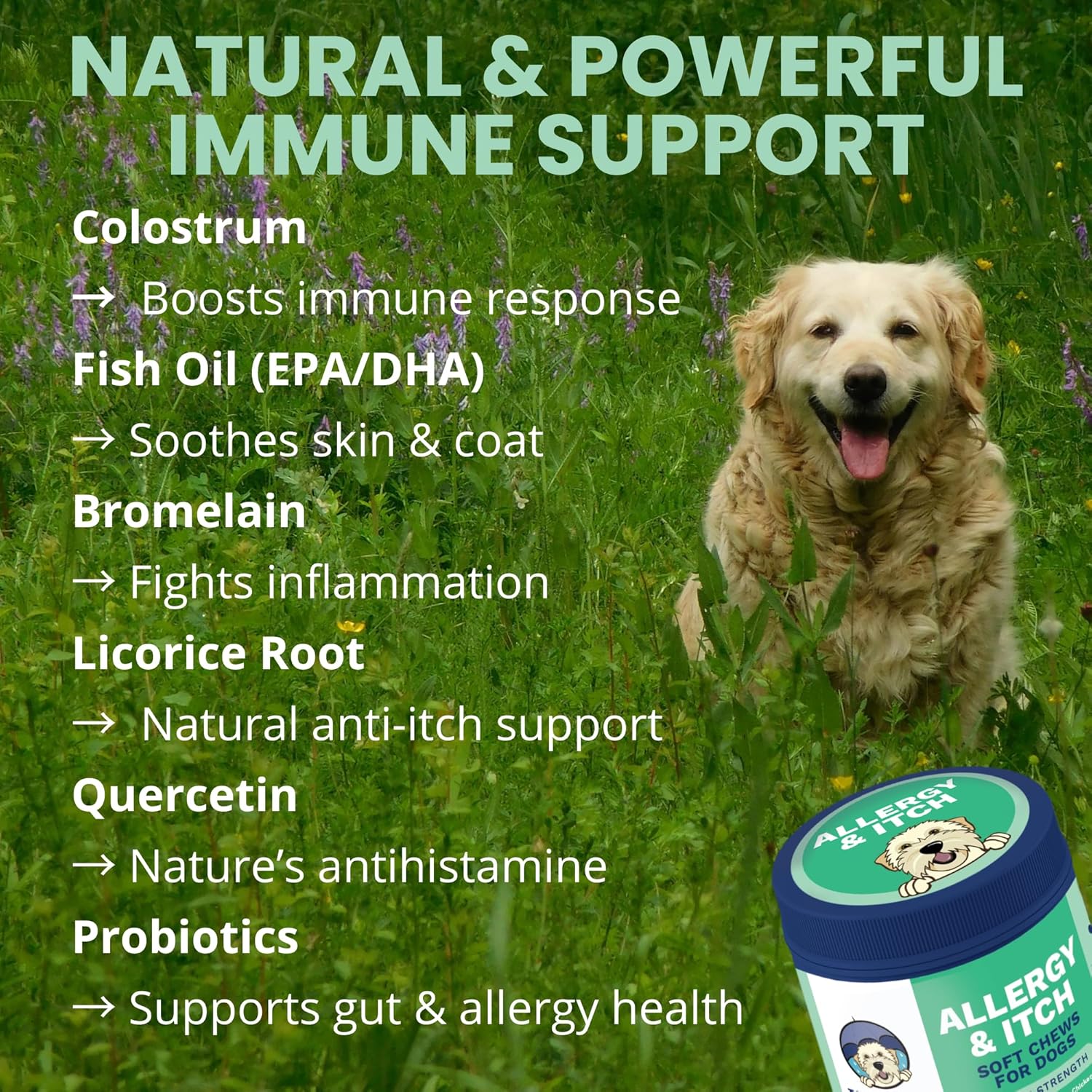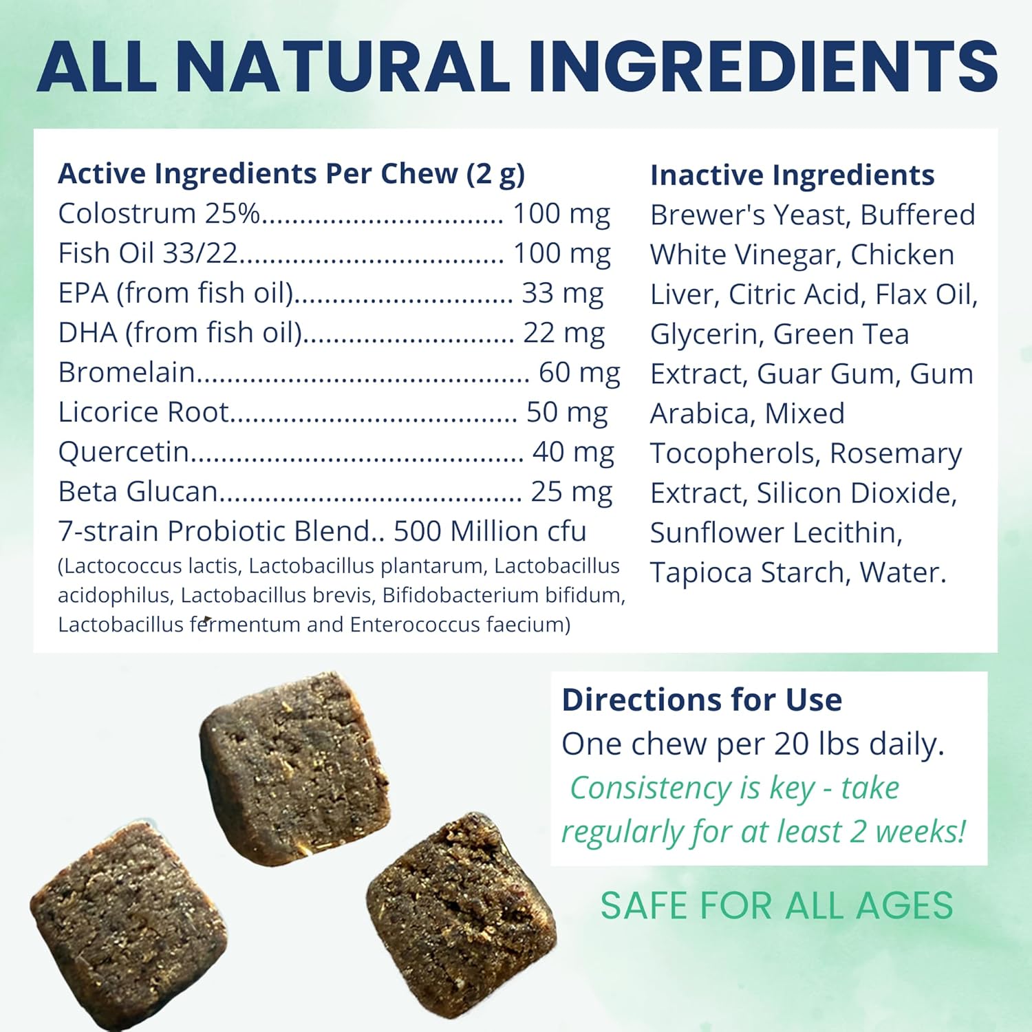 - Targeted Allergy Support for Every Pup: These pet allergy chews are specially formulated to address common signs of allergies like constant licking, paw chewing, and seasonal sneezing. Packed with colostrum, bromelain, and quercetin, they help soothe discomfort and support a calm, balanced immune response from the inside out.