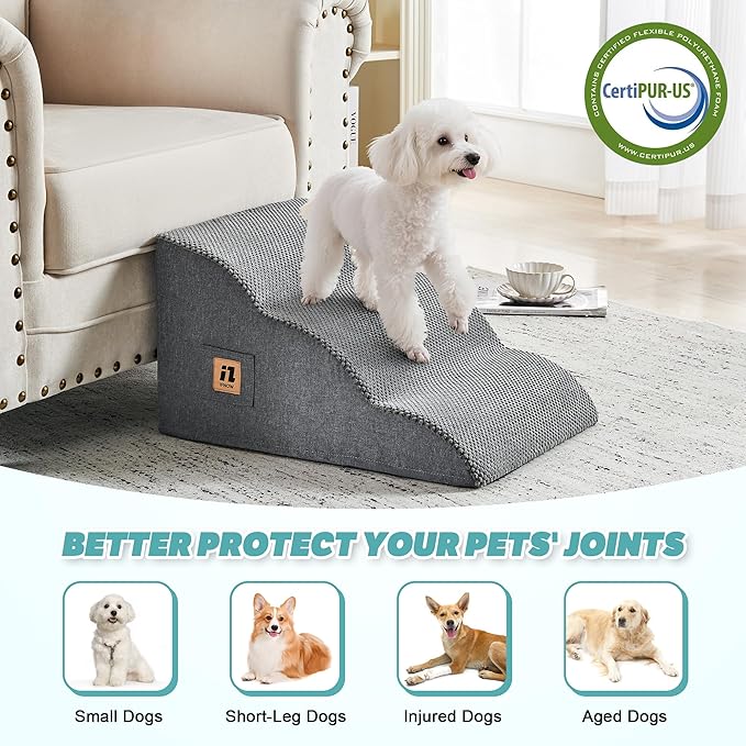 IFNOW Dog Stairs for Small Dogs and Cats 11.8" H, 3-Step Sturdy Dog Steps for Couch, Sofa or Chair, High-Density Foam Pet Stairs for Puppy, Older Cats, Non-Slip Curved Pet Ramp Indoor, Grey