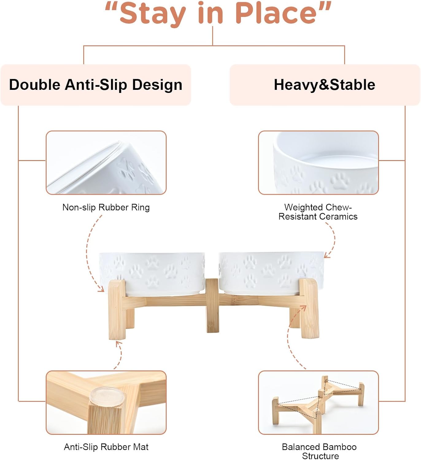- Stable, Tip‑Resistant Design – A solid bamboo frame with Chew‑Resistant Heavyweight Ceramic, wide stance, and slip‑proof silicone pads join forces to create raised dog bowls that STAY IN PLACE on tile, wood, or laminate. Fewer spills mean cleaner floors and no accidental gouges or scratches or noisy