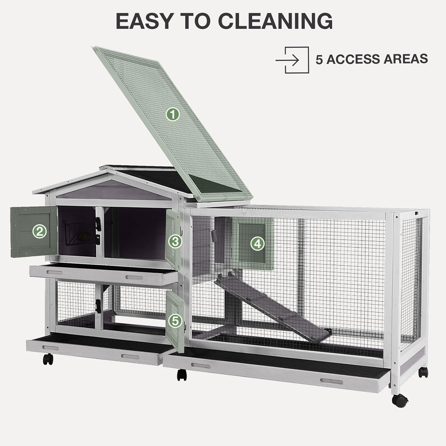 - Easy Cleaning and Maintenance:Designed with convenience in mind, this rabbit hutch features three pull-out trays that are waterproof and leak-proof, making cleaning a breeze. The multiple access points allow for easy cleaning without disturbing your pets