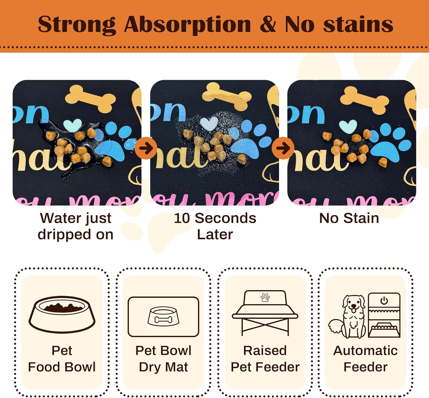 • Waterproof & Easy Clean Dog Food Mats for Floors Waterproof - Unlike regular mats, our heavy-duty dog food mat features a 100% waterproof layer that prevents liquids from seeping through the floor. Simply wipe clean your dog bowl mat after meals - no staining or odors! Works great as both a dog food mat and cat food mat.