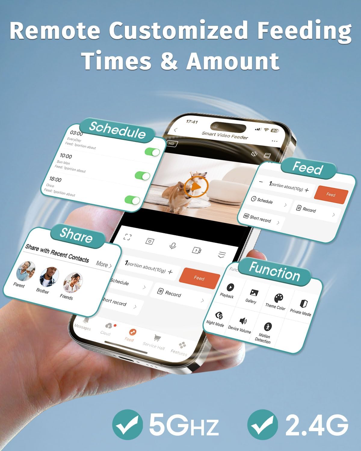 - HD Camera with Night Vision: Automatic dog feeder with camera monitor your pet’s feeding process with the HD camera and night vision feature. Check food levels and ensure meals are completed in real-time. Whether day or night, this smart pet feeder gives you clear visuals to keep your pet’s mealtime secure and monitored
