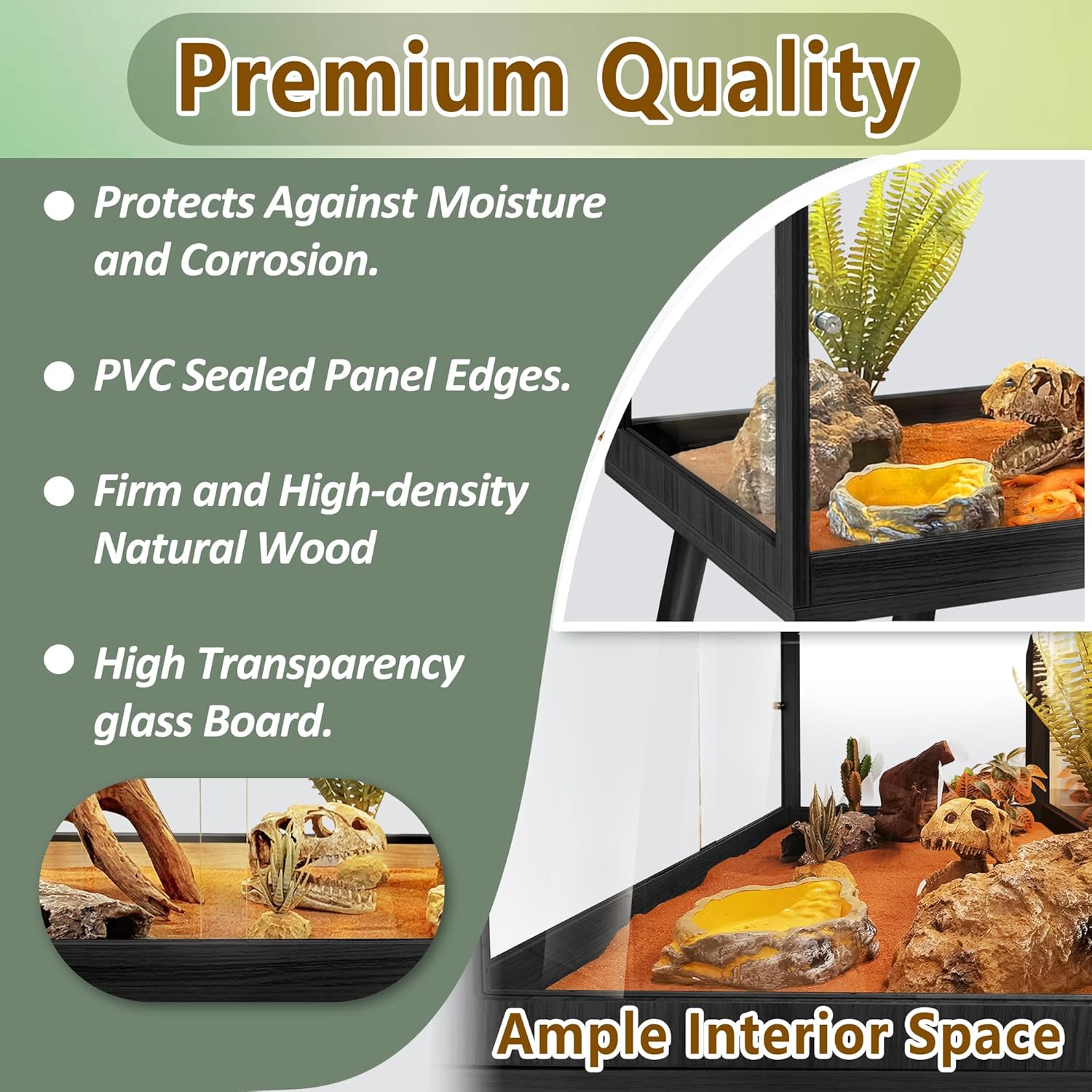 - 【High-Quality Reptile Habitat】Designed for reptile enthusiasts who seek a dependable and comfortable space for their pets, this high-quality habitat is crafted from sturdy solid wood treated with water-repellent coatings on both sides. It's ideal for terrestrial reptiles such as bearded dragons, snakes and tortoise , providing a dry and stable environment for daily activity. Please note: this cage is not intended for aquatic use.