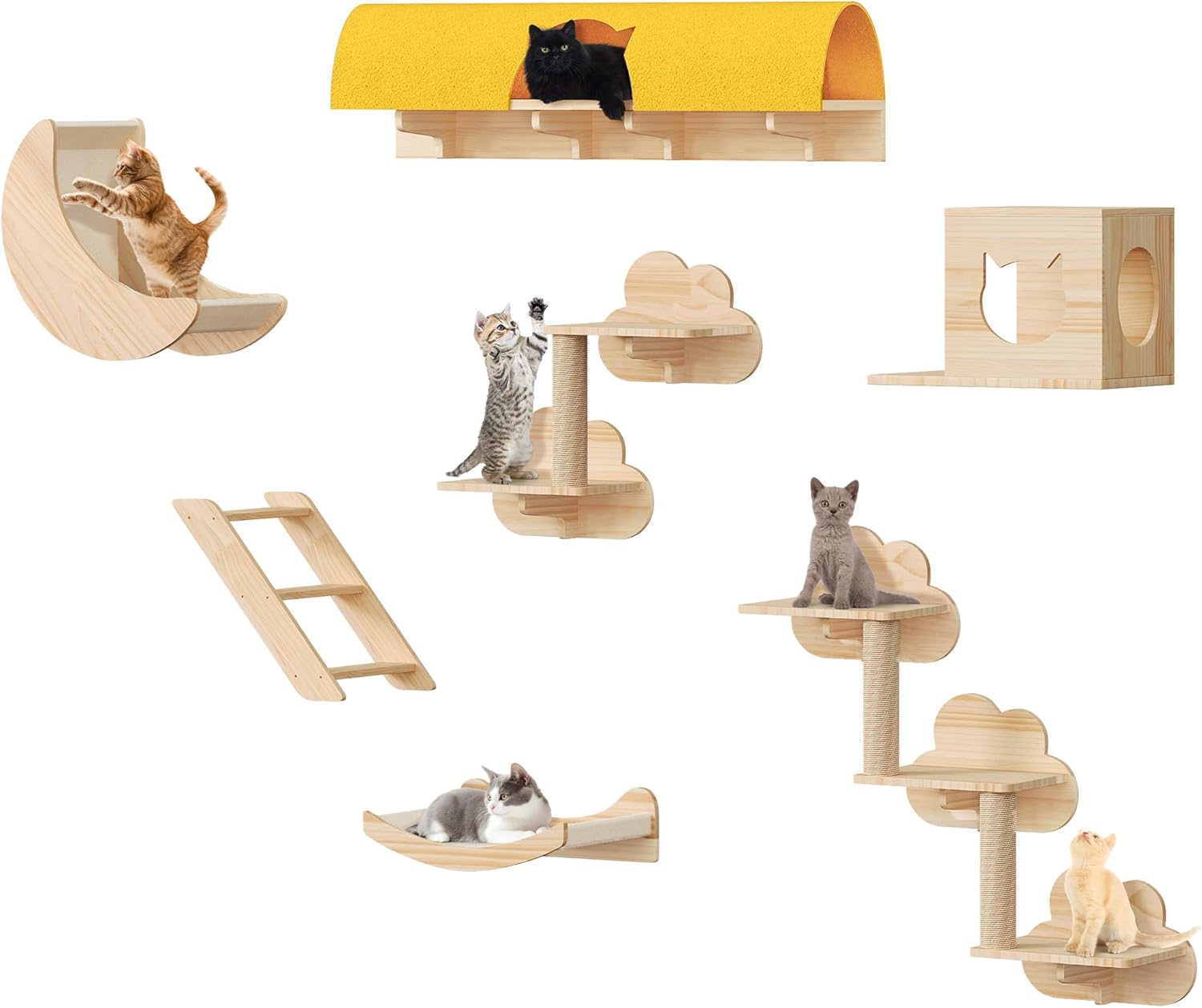 Cat Wall Shelves and Perches, Solid Wood Wall Mounted Cat Furniture, Set of 13 Cat Climbing Shelves with Moon Hammock, House, Wall Ladder, Scratching Post and Cat Tunnel