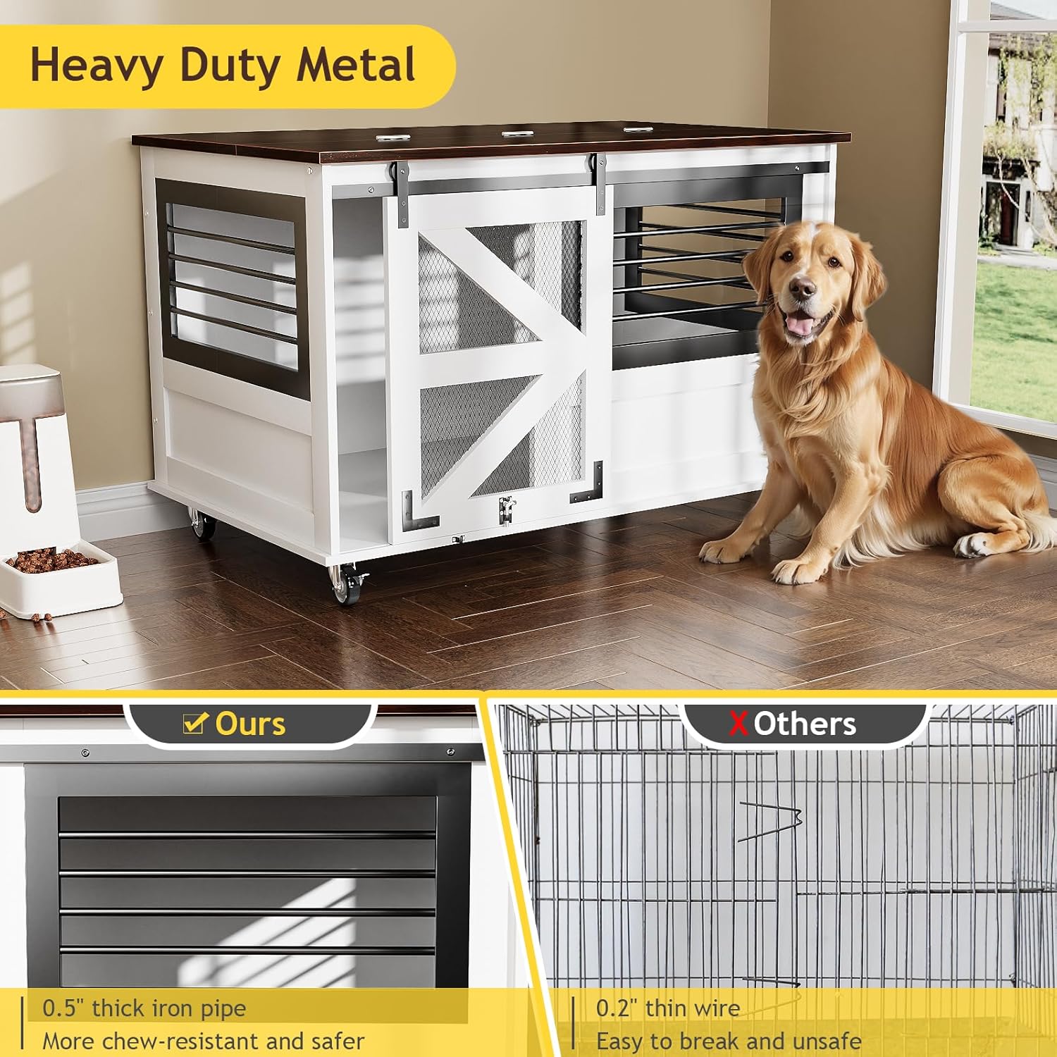 - 【Heavy-Duty Construction】Built to last with 0.6" reinforced wood panels and 0.03" industrial-grade steel framing, ensuring chew-proof durability and a 100+ lb load capacity. Keep the dog from escaping from this heavy duty dog crate while safeguarding your belongings from scratches or collapses.