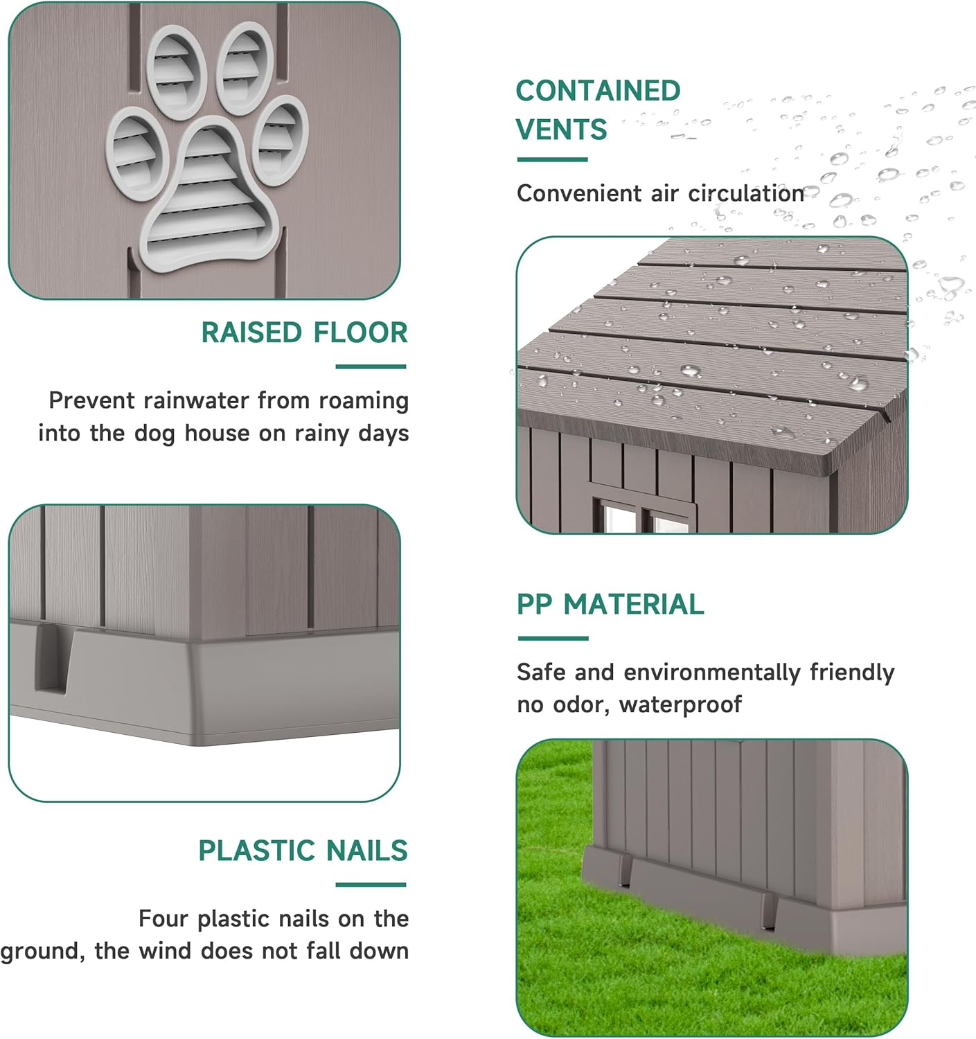 - Strong and Stable: To ensure that the dog house is stable and reliable, we have equipped it with plastic nails. These pegs can firmly fix the dog house on the grass, preventing it from moving easily due to your dog's activities or external factors such as wind.