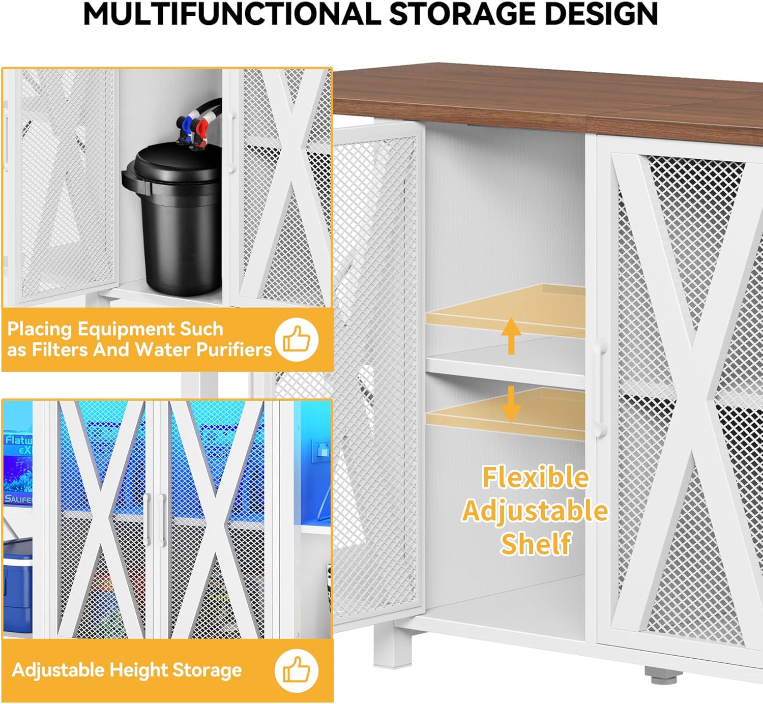 - Orderly storage: This fish tank with stand easily keeps everything organized. The built-in cabinet stores fish food, cleaning tools, and other accessories while the adjustable shelves help accommodate items of various sizes