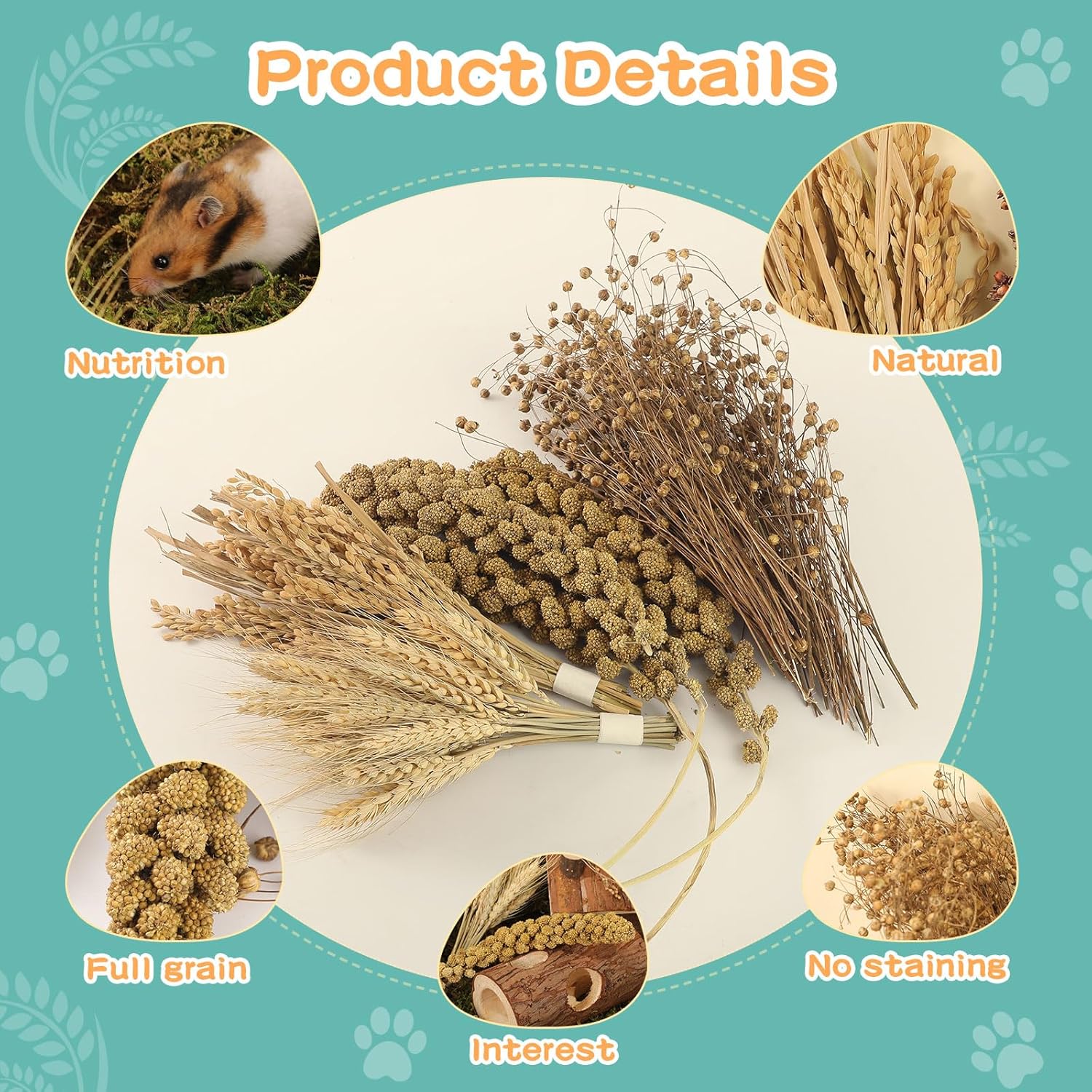 - TAOKEKE hamster spray set contains content: you will get wheat bouquet (35sticks), flax (50g), yellow millet (4sticks) and sorghum millet (25sticks), providing safe chewing toys and foraging rich toys for warehouses, sand, mice and other small pets