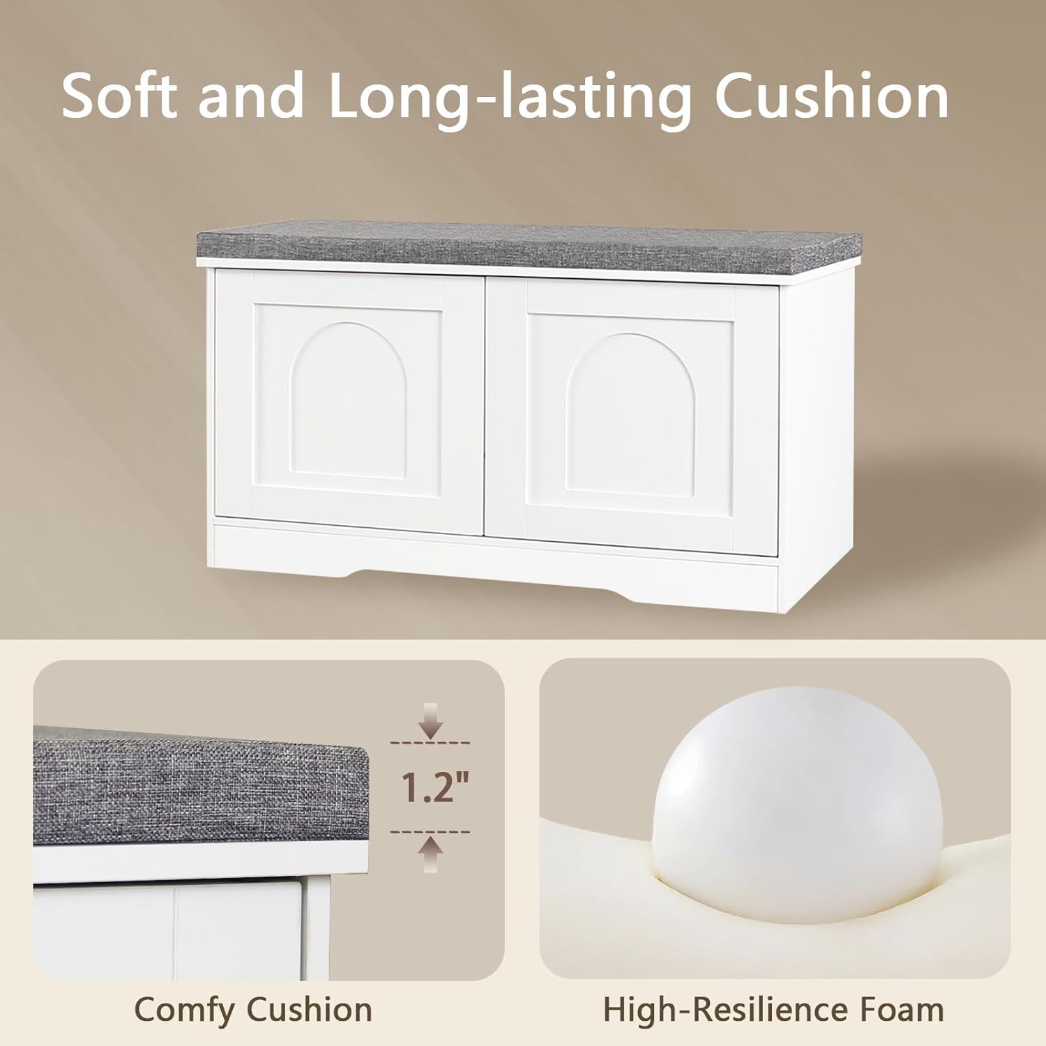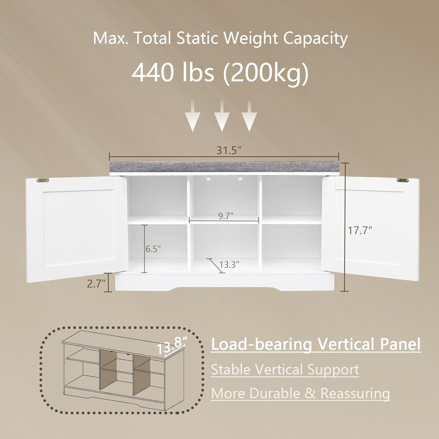 DINZI LVJ Shoe Bench, Entryway Storage Bench with Doors, Cushion, 2-Tier Shoe Rack with 6-Cubby, 31.5”L x 13.8”W Shoe Organizer Cabinet, Adjustable Shelf, Living Room, Bedroom, White