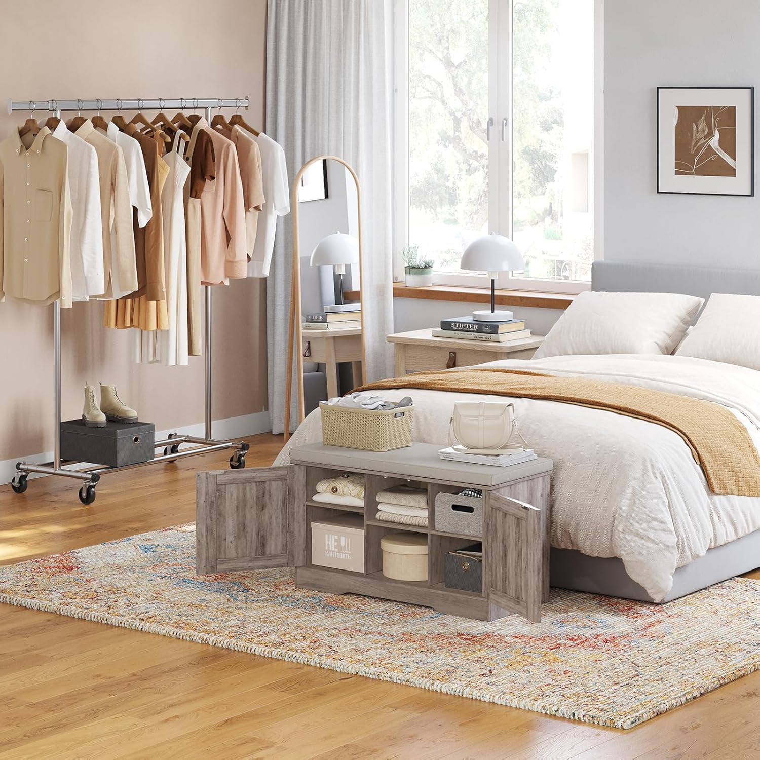 - 【Flexible for Multiple Needs】2 middle compartments are fixed for sneakers, high heels and sandals. The side compartments have 3 adjustable heights for slippers, tall boots or storage boxes. Use as an entryway bench, window seat or bedside bench to store blankets, books and toys in the living room and bedroom