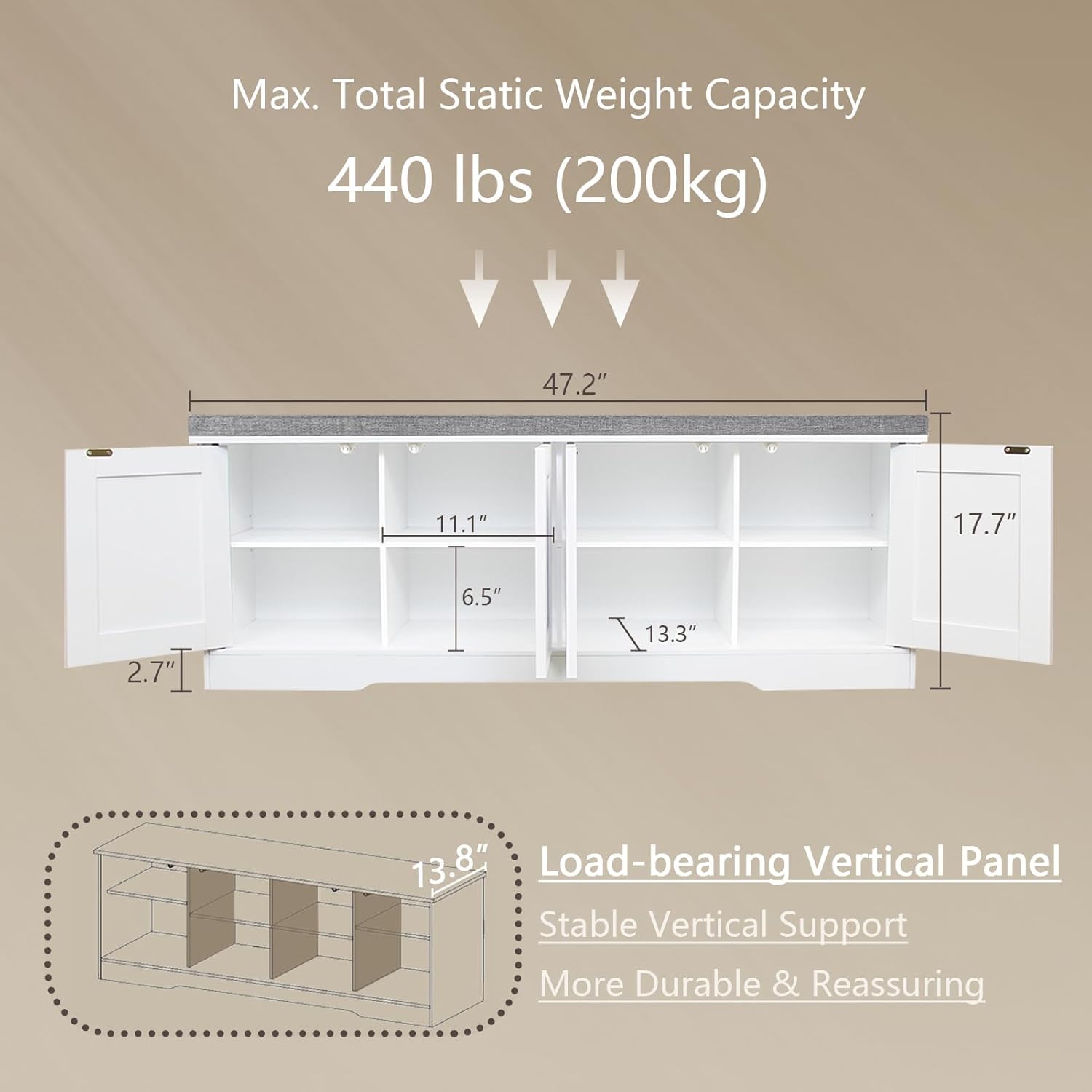 - 【Stable & Long-lasting】The shoe rack bench is made of high quality particle board. Durable compartments design provides extra vertical support, enabling it to bear a load up to 440lbs (200kg). Its removable padded design can help you remove and clean cover easily. Dimension: 47.2”L x 13.8”W x 17.7”H