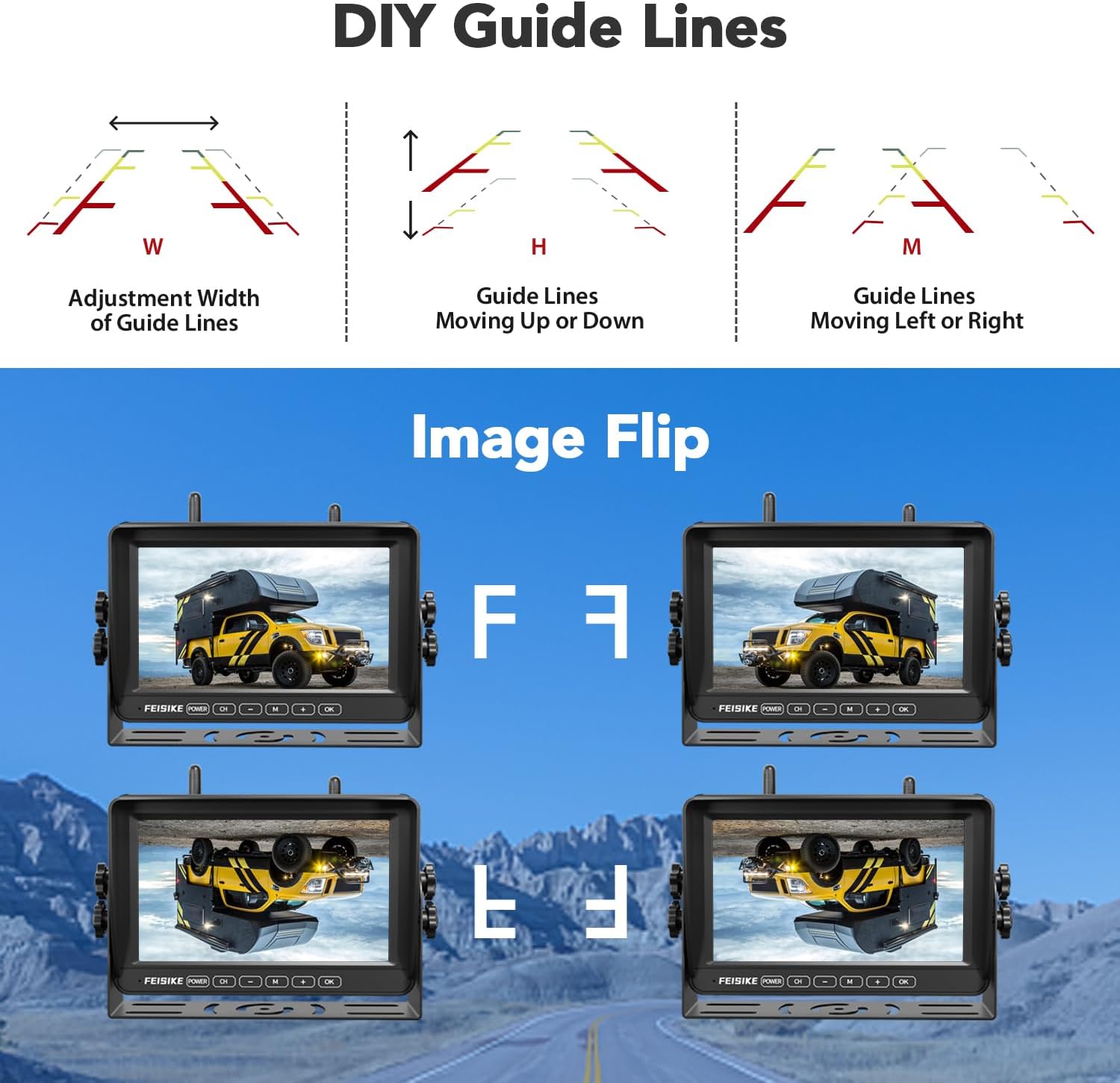 - 【Customizable View with DIY Parking Lines】Easily adjust brightness, contrast, and saturation to suit your preference. Use image flip and on-screen parking guidelines to make reversing easier—no need to turn your head constantly. The IP69 waterproof rating means it resists rain, snow, fog, heat, and cold—perfect for RVs, trailers, trucks, campers, buses, and more. No more water-damaged or foggy lenses.