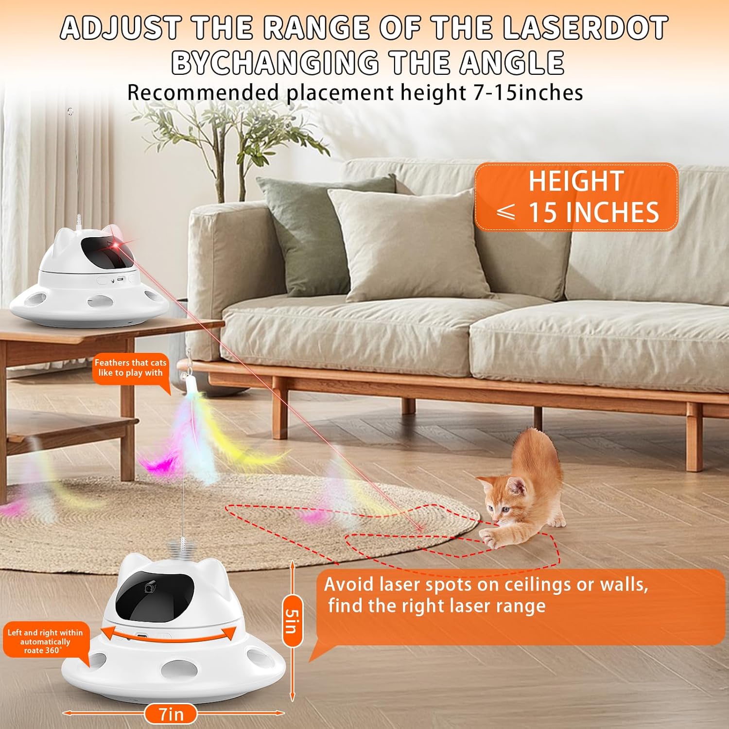 - π― 3-in-1 Cat Laser Toys Unique dots, stars, butterflies, mice, smiling faces, laser patterns, automatic 360 Β° random laser trajectory, unpredictable red laser motion stimulates cats to chase and play. The head teasing cat stick bell feathers attract cats to slap, and feathers are randomly shot out from 6 holes to encourage your cat to pounce and slap. Perfectly matched with various scenarios, there is no need to worry about indoor cats hitting anything that may fall or break.