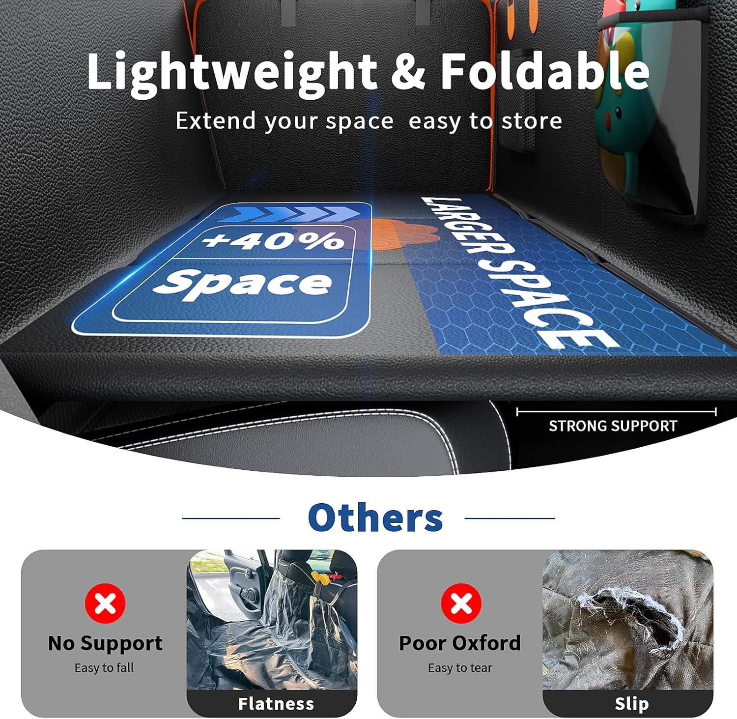 - 【𝐄𝐱𝐭𝐞𝐧𝐝𝐞𝐝 𝐒𝐩𝐚𝐜𝐞 & 𝐒𝐞𝐜𝐮𝐫𝐞 𝐑𝐢𝐝𝐞】Transform your back seat into a spacious dog hammock for car! This heavy-duty back seat pet cover for dogs expands to 55"x25", adding 40% more activity space for large breeds or multi-dog families. The hard bottom supports 400lbs, while the EVA non-slip backing keeps the cover stable – let your pups stretch safely on long trips!