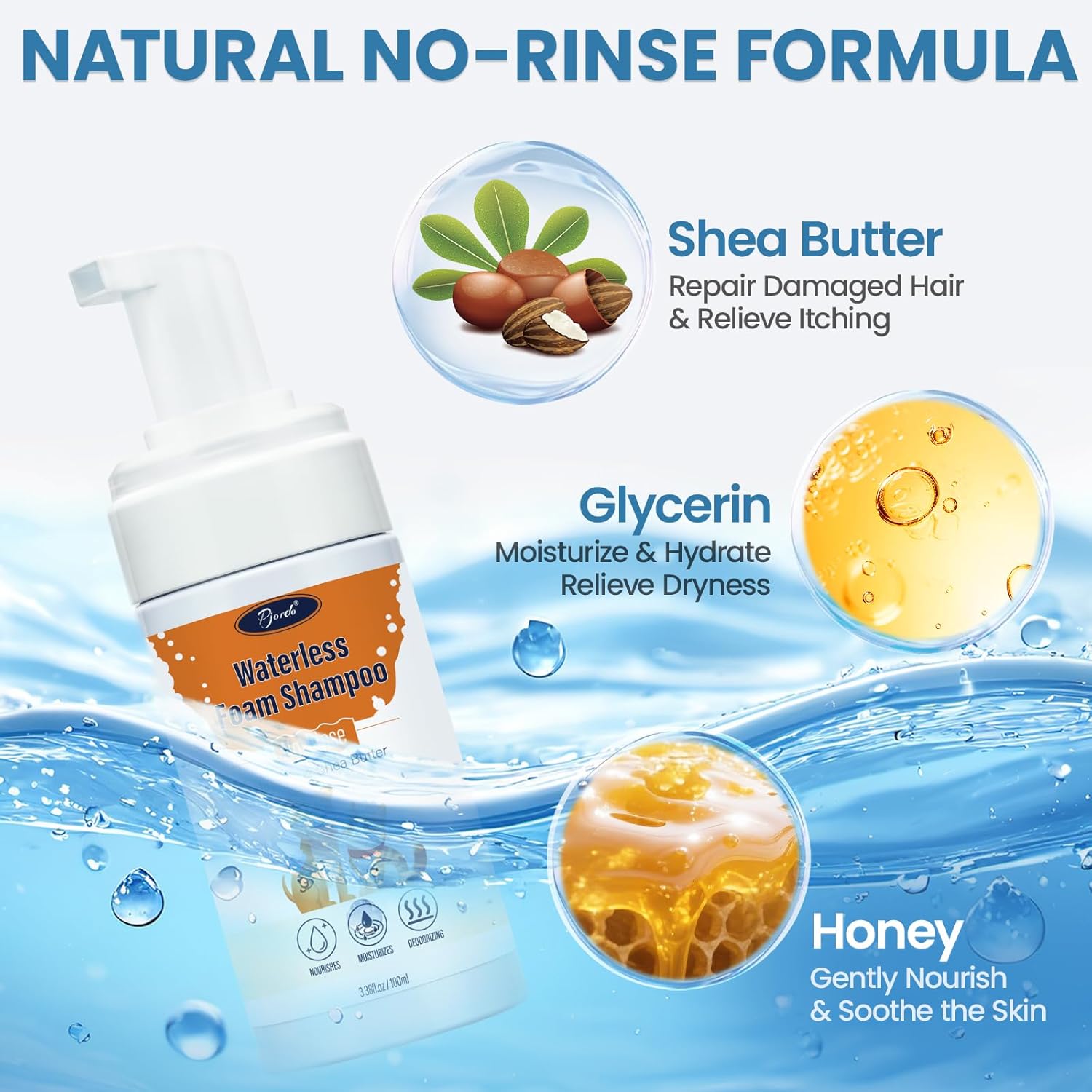 - The term "Waterless" in Waterless Shampoo doesn't mean that there is no water in the product's formula. Instead, it refers to the convenience that after applying this shampoo, there is no need to rinse your pet‘s fur with water. Compared to regular pet shampoos, which usually require thorough rinsing, our Waterless Shampoo saves you time and effort, making the grooming process simpler and more efficient.