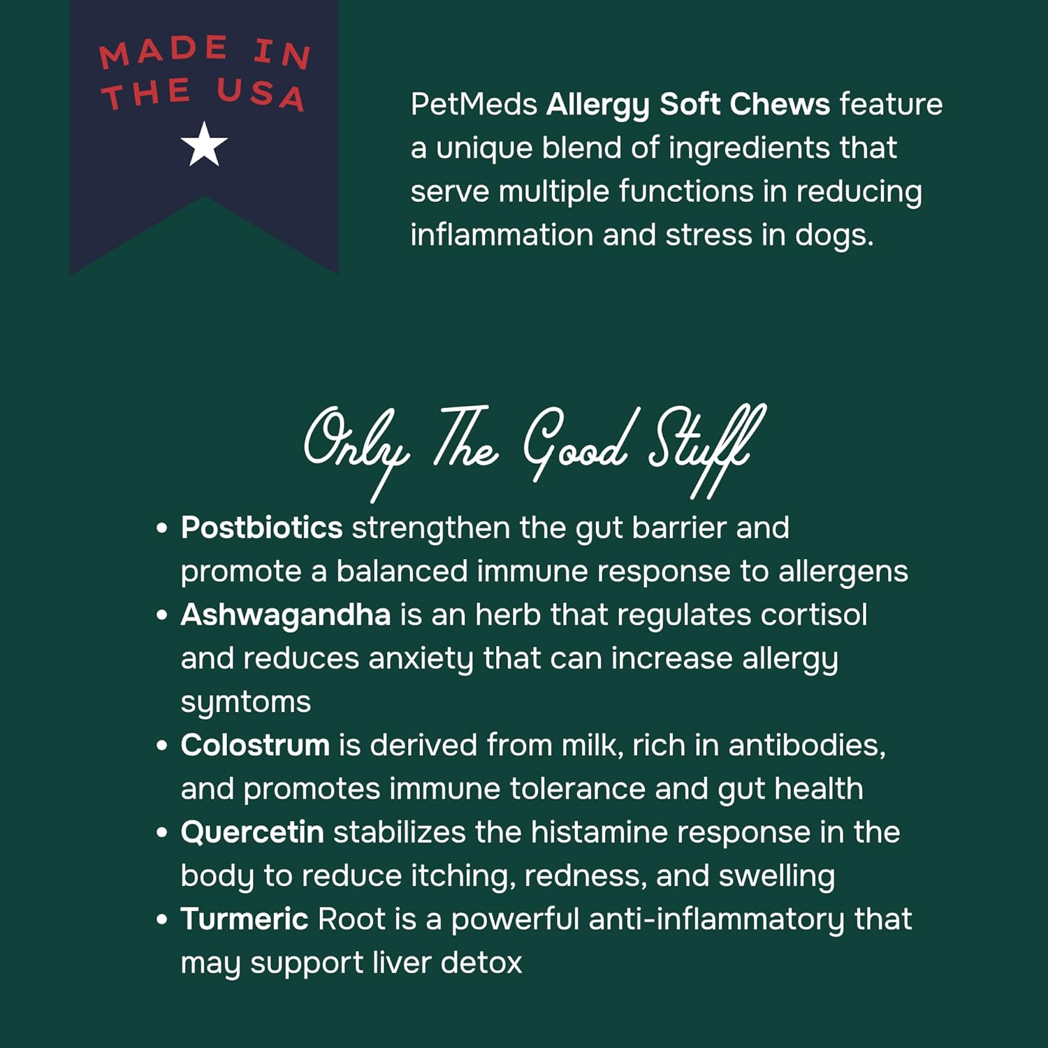 - Vet-Formulated & Made in the USA – Expertly crafted with high-quality ingredients, PetMeds Allergy Chews are made in the USA to ensure safety and effectiveness you can trust.