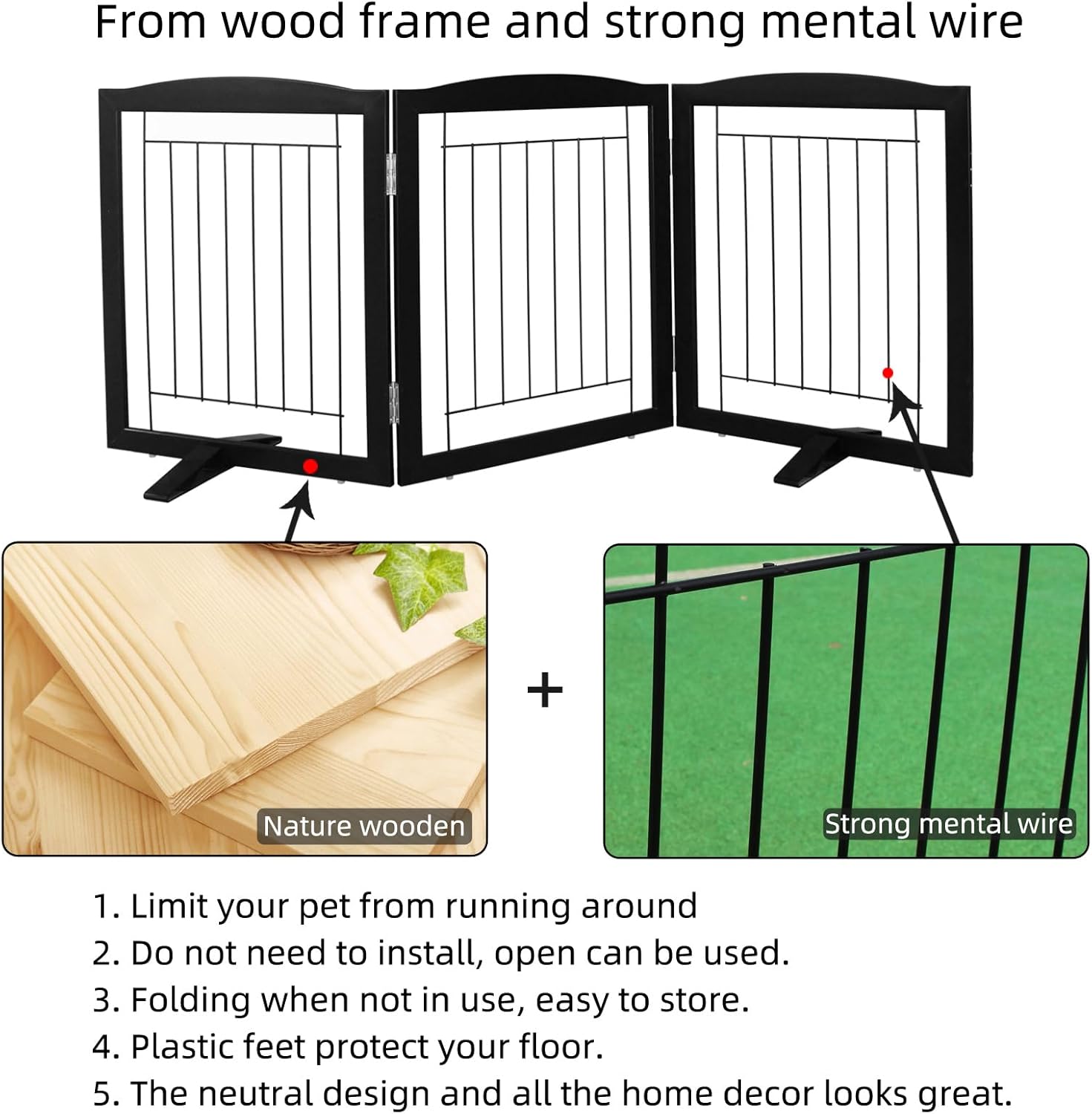 ZJSF Freestanding Dog Fence Indoor, Foldable Dog Gate for Doorways, Stairs or Hallways, Sturdy Wood Extra Wide Pet Gate with Support Feet for The House, Black, 24 "Height-3 Panels