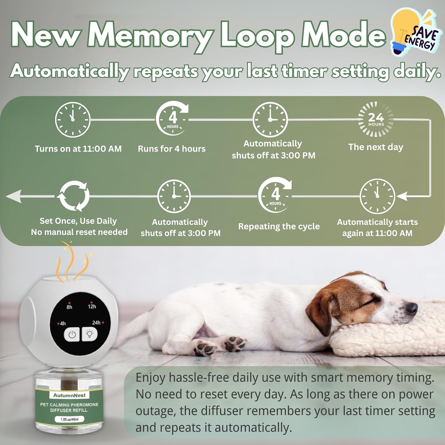 - 【Smart 4-Level Timer Design – No More Repeated Plugging】 This upgraded dog calming diffuser for dogs features 4 intelligent timing modes: 4H / 8H / 12H / 24H. Easily adjust with one button. Automatically shuts off when time is up, no need to unplug. Keeps your home calm on your schedule.