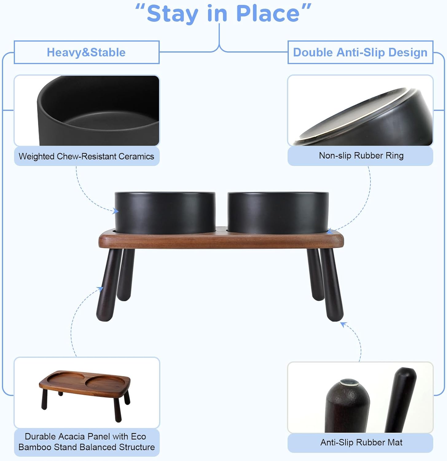 - Stable, Tip‑Resistant Design – A solid acacia wooden panel eco bamboo legs stand with Chew‑Resistant Heavyweight Ceramic, wide stance, and slip‑proof silicone pads join forces to create raised dog bowls that STAY IN PLACE on tile, wood, or laminate. Fewer spills mean cleaner floors and no accidental gouges or scratches or noisy
