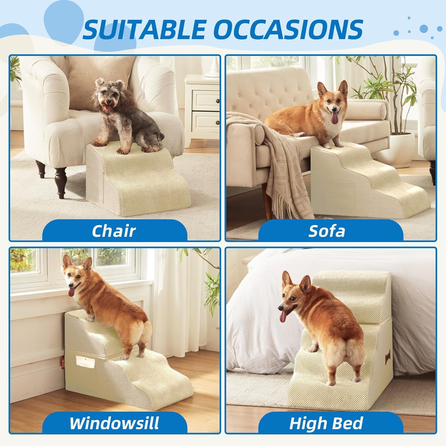 - Safety and Reliability: High-density memory foam provides excellent support, ensuring optimal support while protecting your dog's knee; The lightweight foam material is easy to carry, and even with repeated use, the pet stairs won't deform