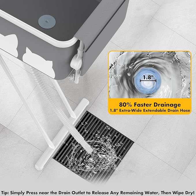 - Quick-Drain Design with Oversized Hose —Equipped with a 1.8-inch extra-wide & extendable drain hose for quick water flow—NO MORE LONG WAITS! Easily direct water into a floor drain, tub, shower, or bucket. More comfortable, efficient and faster—bathing your pet has never been easier!