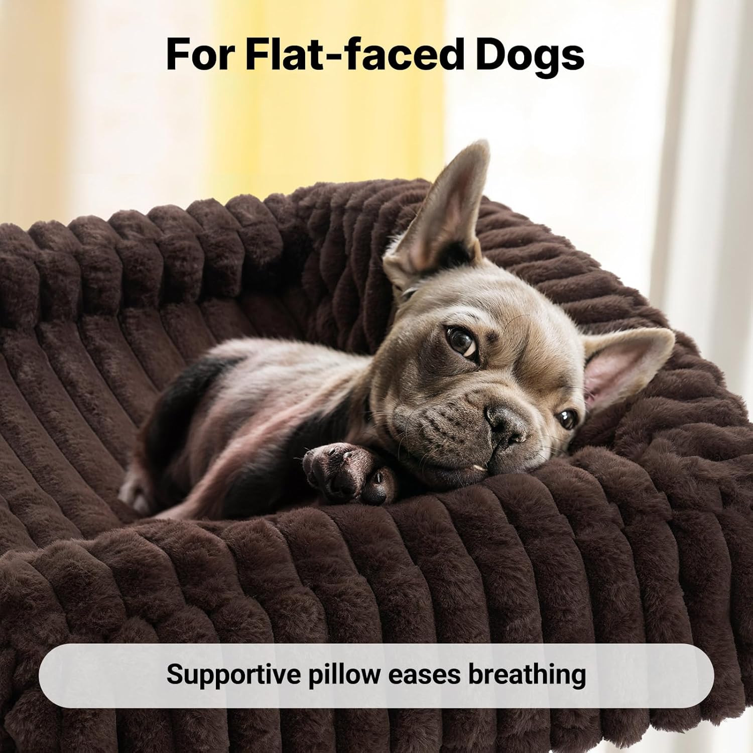 - Secure & Comfortable: The three-sided bolster provides all-around security, while the pillow offers neck support and promotes better breathing, especially for flat-faced breeds. The fluffy plush surface offers calming relaxation