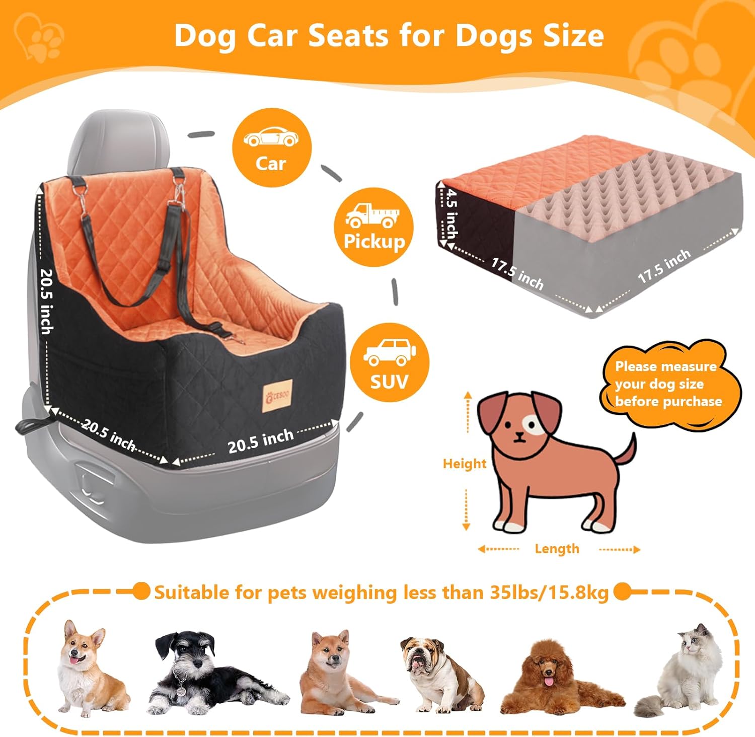 - Ideal Size for Dog Car Seat - The size of the Small/Medium dog car seat is 20.5in x 20.5in x 20.5in, Can be installed very well on the front or rear seats of cars. Which can easily accommodate 40 lbs small and medium-sized dogs within pounds for Yorkshire Terriers, Schnauzers, Corgis, Bulldogs, Chihuahuas, Pomeranians, Dachshunds, Shih Tzus, puppies, cats and more.