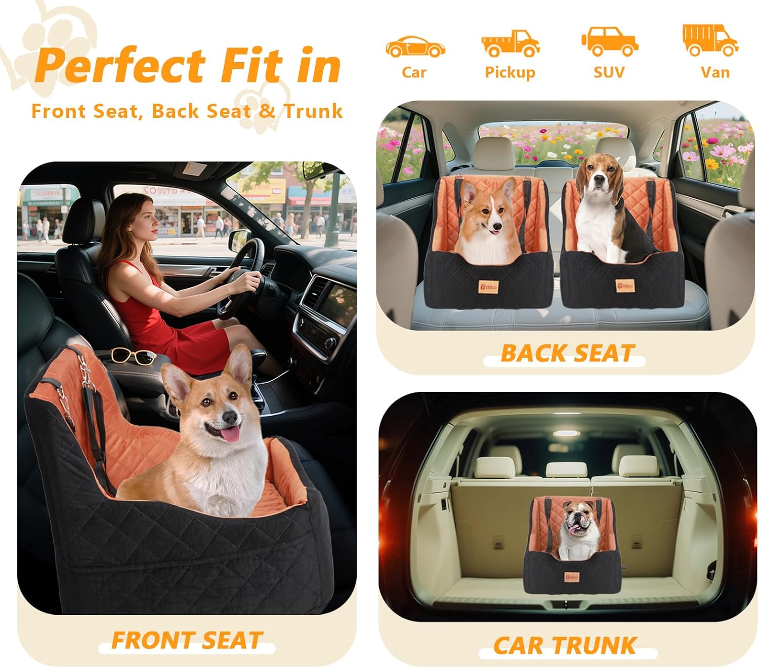 - After Multiple Security Tests - The Car seat for dogs with dog leashs and top safety strap has undergone new exterior design, We conducted multiple safety tests, including start stop brake, emergency brake, and sharp turns. The results indicate that our pet car seats perform better in terms of practicality and safety than commonly seen dog booster seats on the market.