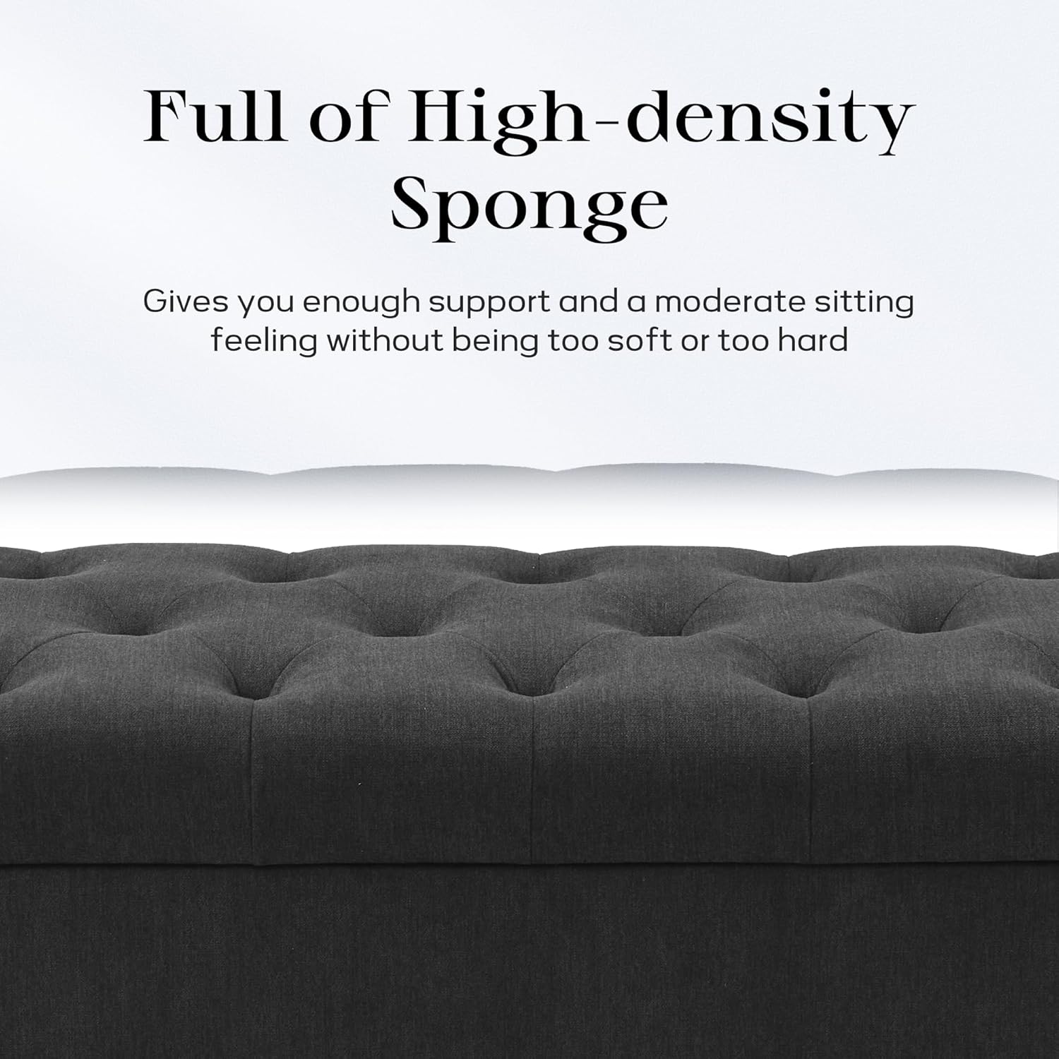 - QUALITY MATERIAL: The end of bed storage bench is made of textured fabric, high density foam and wood frame. The texture of the fabric adds warmth to your home decor. The high-density foam is both flexible and supportive, giving you a comfortable sitting experience that is not too soft and not too hard. The product presents an overall square design with a simple and versatile style that is suitable for a variety of decor