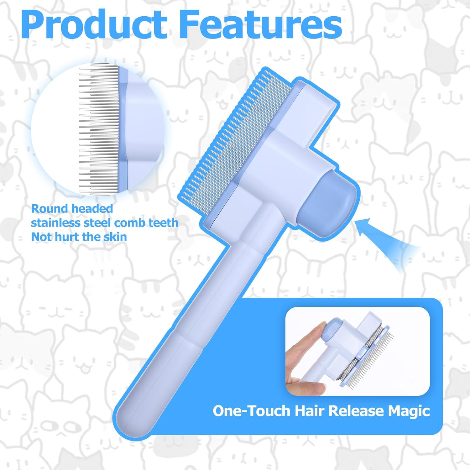 Zen Brush for Cats: Cat Flea Comb & Dematting Comb for Cats - Self-Cleaning Pet Hair Removal Tool with Long & Short Stainless Steel Teeth, Blue Pink