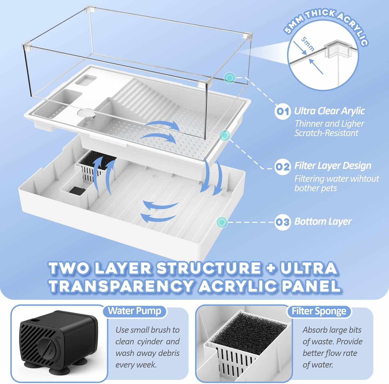 - γTWO-LAYER DESIGN - EASY TO CHANGE WATERγTurtle tank base is a 2-layer separated design. Lift the first layer, food residue and excretion will sink into the bottom layer, then you can pour out all watse in the bottom layer and add fresh water; Save your time and trouble to drainage from a tiny hole slowly. During the process, your pet and other decorations in the tank just need to stay put and remain undisturbed. Note: Water should be refreshed 1-2 times per week, even with water pump.