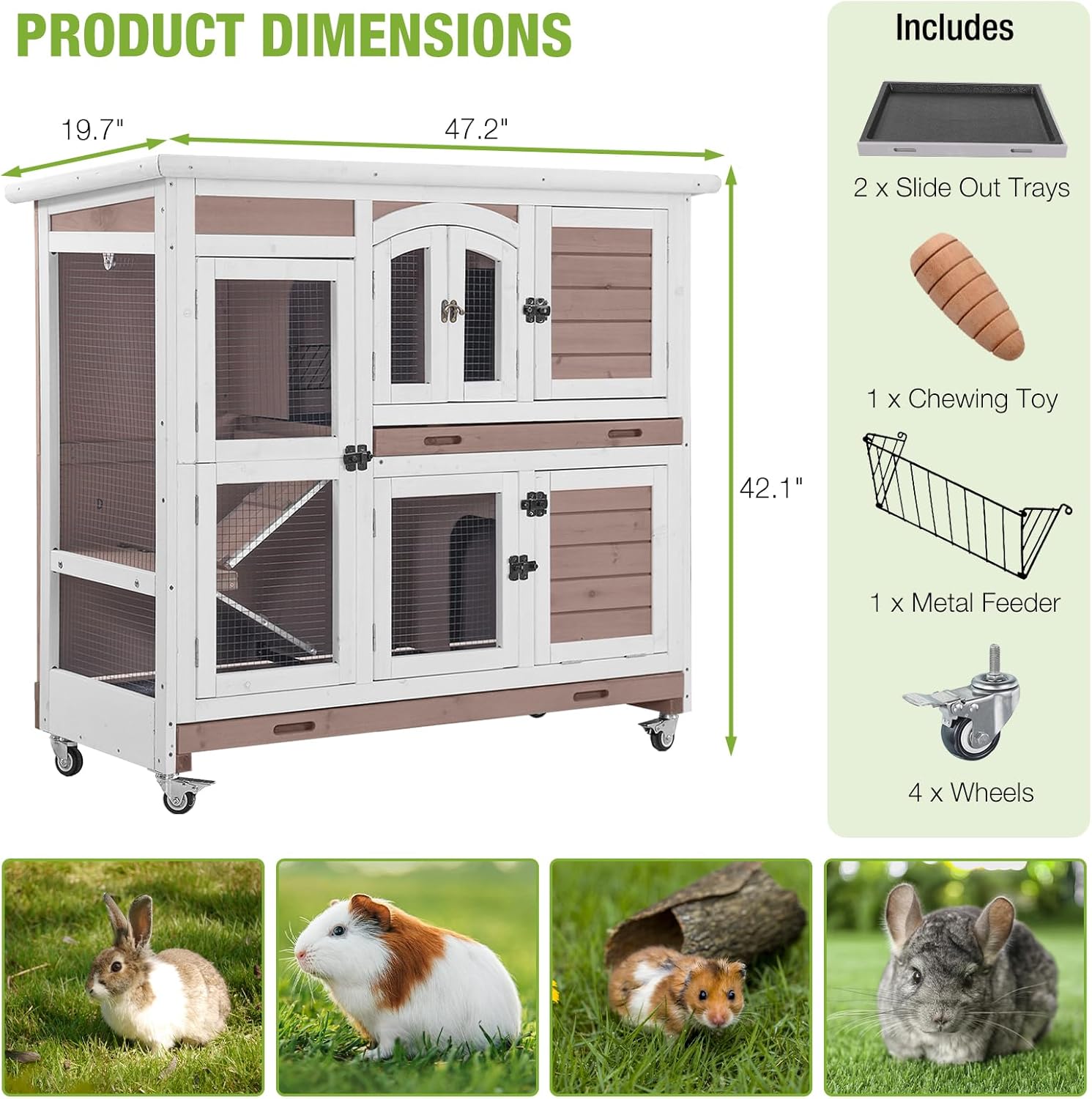- Spacious 2-Story Design: Two-story rabbit hutch measuring 47.2" L x 19.7" W x 42.1" H, provides ample living space for rabbits, guinea pigs, hedgehogs to move, rest, and play comfortably. The multi-level structure expands activity space while keeping small animals safely contained.