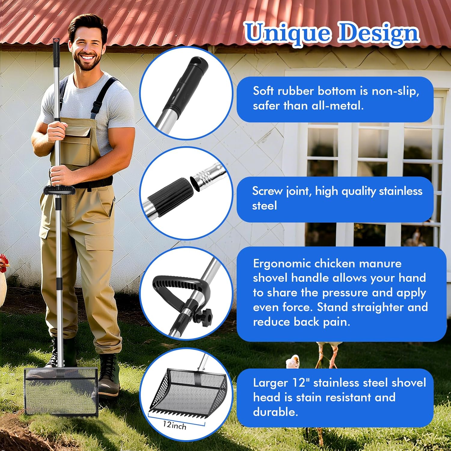 - Large Metal 12Inch Chicken Poop Scooper & Rake 2-in-1: Stainless steel handle with adjustable rubber grip for single- or double-handed operation. Reduces hand and back fatigue, ideal for tall users, the elderly, and daily chicken coop cleaning. Back and knee-friendly.